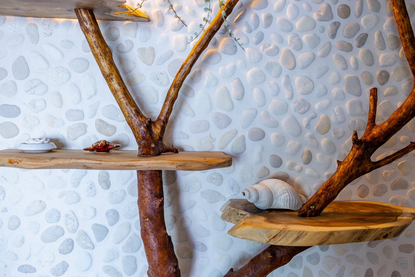 De sfeervolle badkamer biedt een ruime inloopdouche en een dubbele wastafel met spiegelverwarming. Het toilet bevindt zich naast de badkamer.