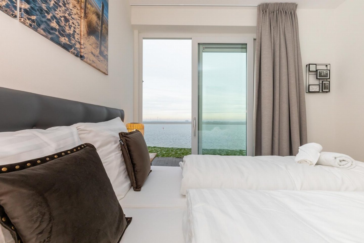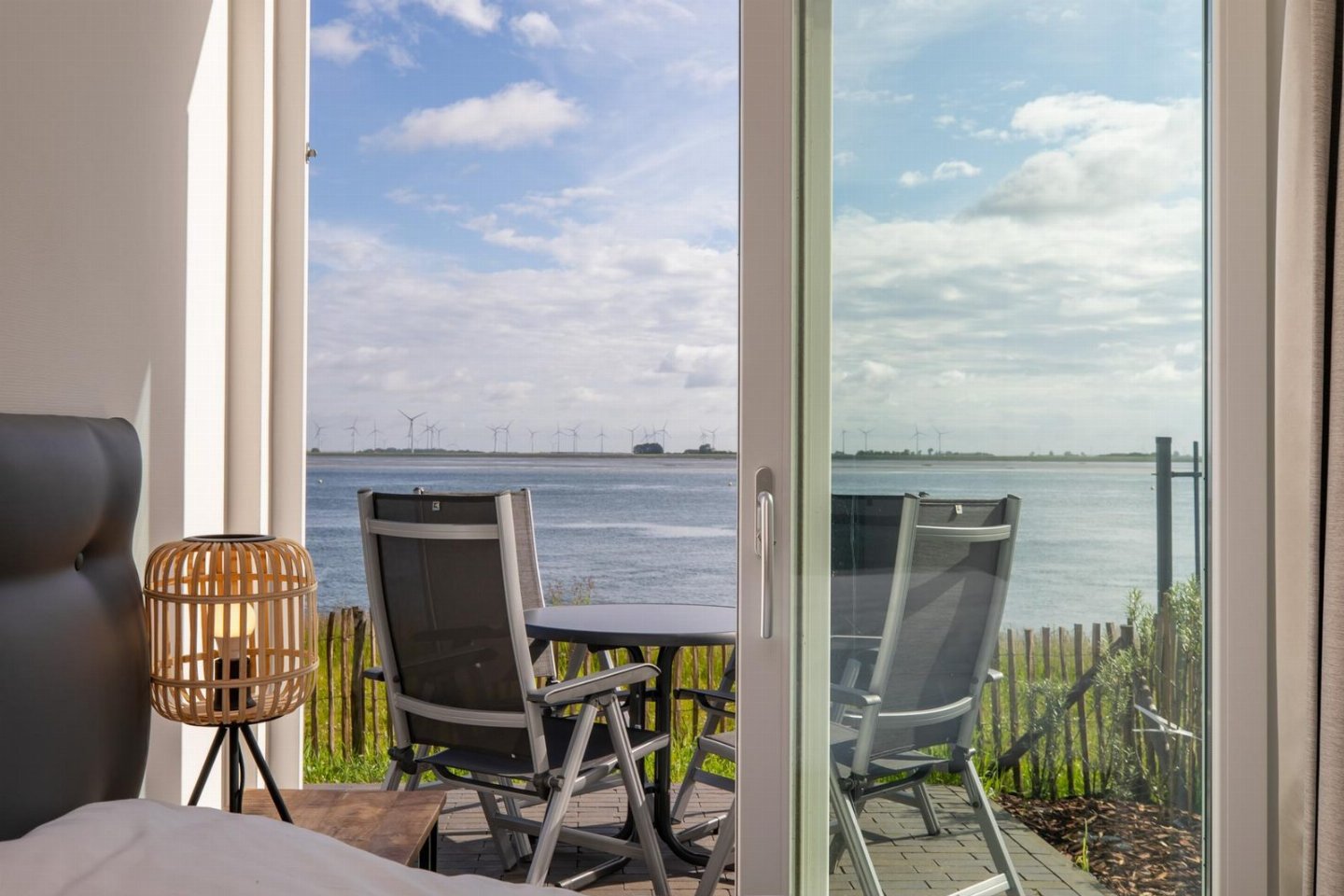 De slaapkamer aan de zeezijde, gelegen naast de woonkamer, is voorzien van een tweepersoonsbed met twee losse matrassen (160x200cm / 2 x 80x200cm), 2 nachtkastjes met verlichting en een kledingkast. De ramen zijn voorzien van een verduisterend gordijn maar deze zou je bijna open laten want vanuit je bed kijk je direct de Oosterschelde over, een unieke beleving! Zowel vanuit deze slaapkamer als de woonkamer heb je direct toegang tot de op het noorden gelegen tuin met uitzicht over de Oosterschelde.