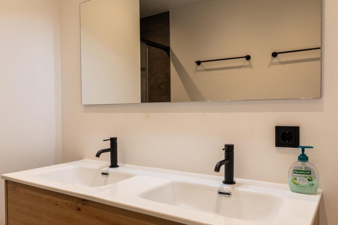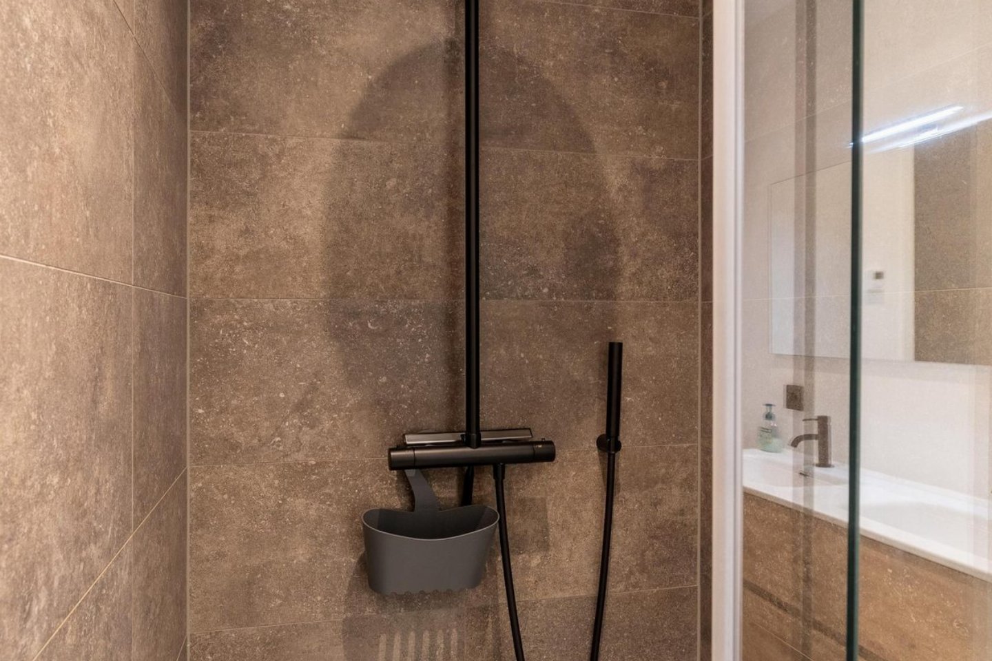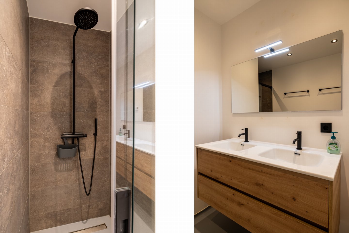 De badkamer is modern ingericht en voorzien van een inloopdouche (met regendouche en losse douchekop) en een wastafel met spiegel en föhn. Het toilet met fonteintje bevindt zich buiten de badkamer.Â