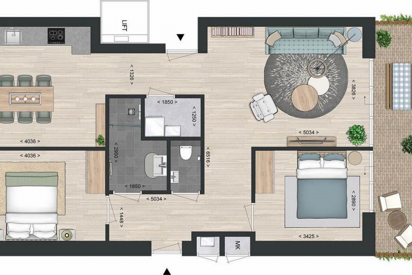 De accommodatie is voorzien van twee slaapkamers, ieder gelegen aan een andere kant van het appartement. Zo kan je zelf kiezen welk uitzicht je het allerliefste ziet zodra je wakker wordt.Â