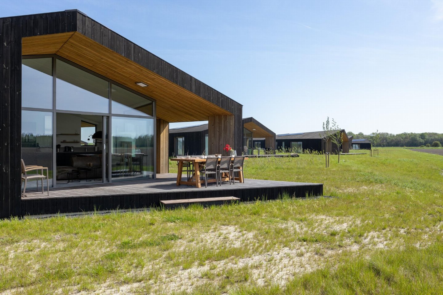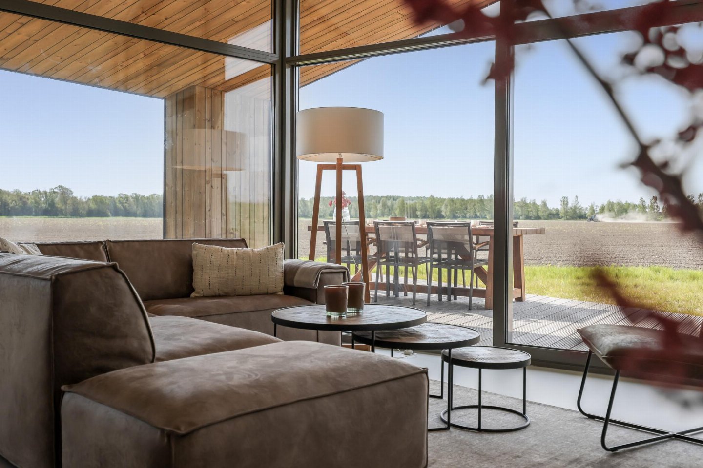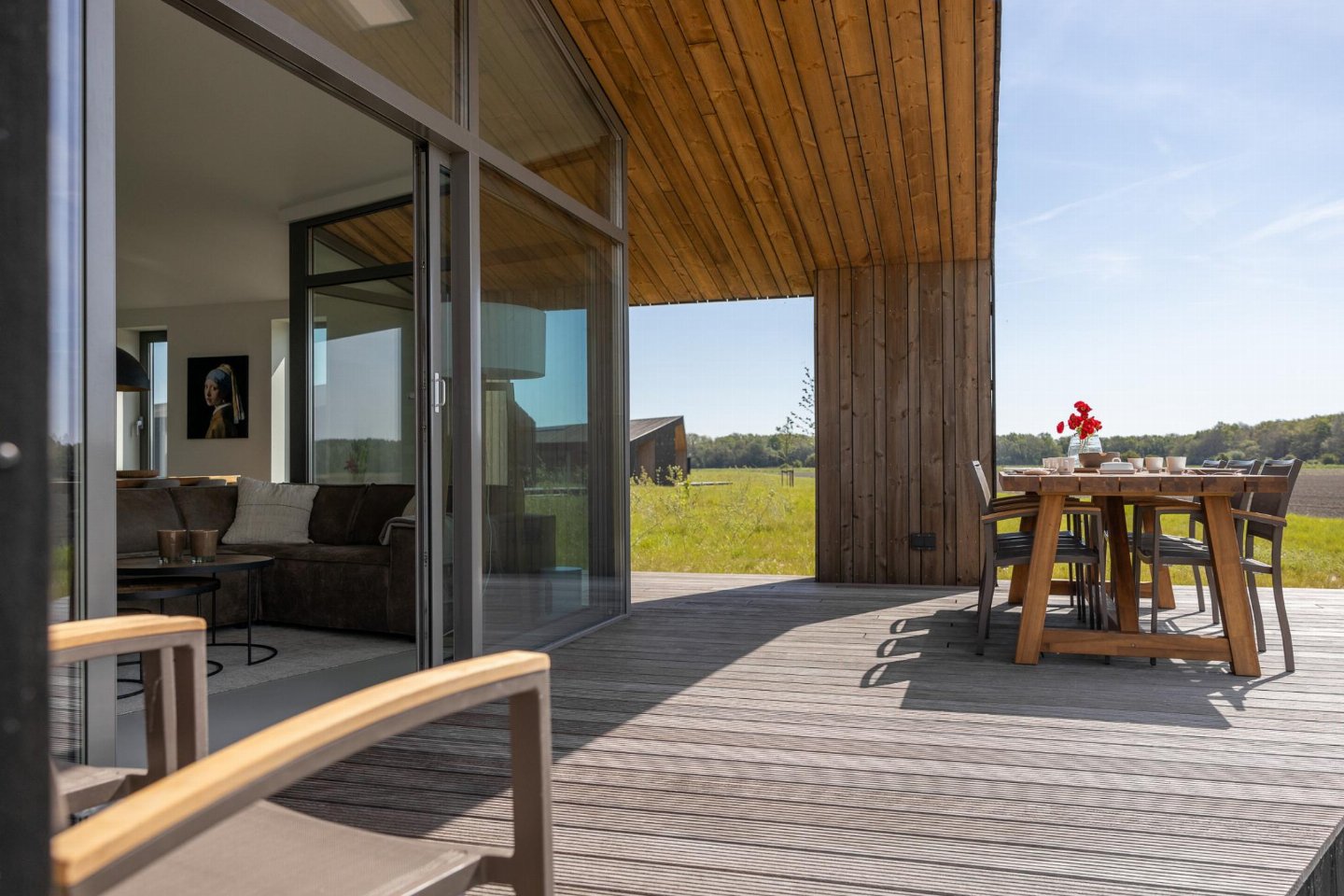 Vrijstaand natuurhuis van ca. 85 m² met stijlvol ingerichte woonkamer en open keuken. Beschikt over 3 slaapkamers en een badkamer met douche, wastafel en toilet, plus een extra separaat toilet in de hal. Rondom zijn meerdere terrassen met vrij uitzicht over de landerijen