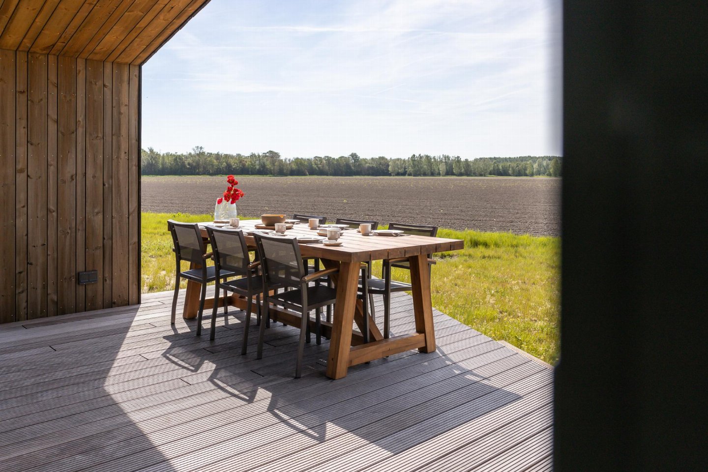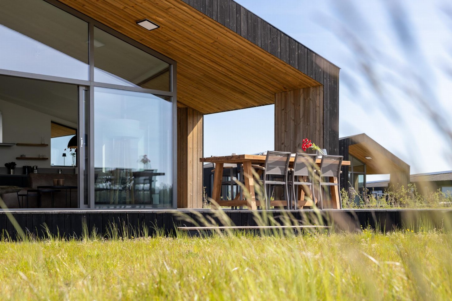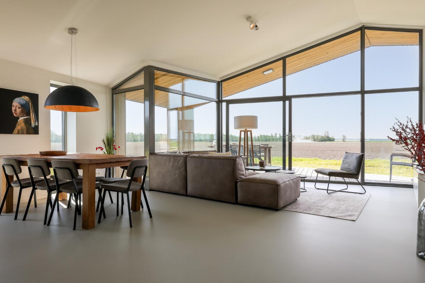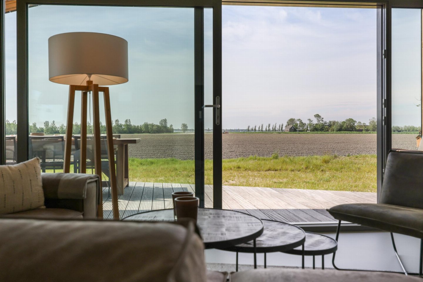 Vrijstaand natuurhuis van ca. 85 m² met stijlvol ingerichte woonkamer en open keuken. Beschikt over 3 slaapkamers en een badkamer met douche, wastafel en toilet, plus een extra separaat toilet in de hal. Rondom zijn meerdere terrassen met vrij uitzicht over de landerijen