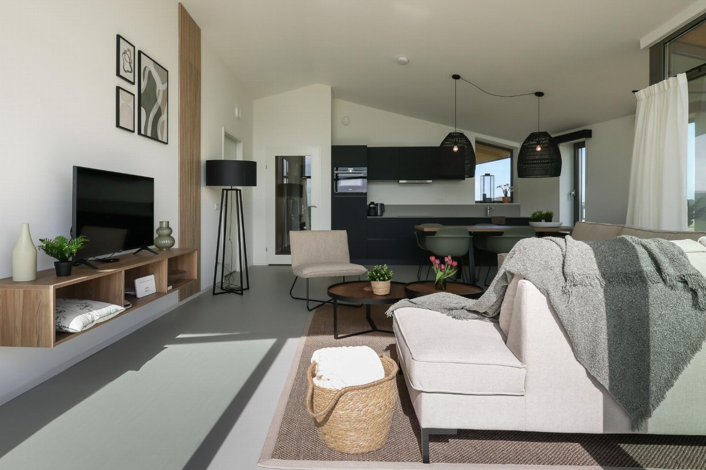 Begane grond(eigen entree): woonkamer met TV, eettafel(6 personen), zithoek , open keuken met waterkoker, fornuis, afzuigkap, koffiezetapparaat(Dolce Gusto), combimagnetron, afwasmachine, koelkast , slaapkamer met 2-pers. bed, wastafel , slaapkamer met 2-pers. bed , slaapkamer met stapelbed , badkamer met douche, wastafel, wc , toilet met wc