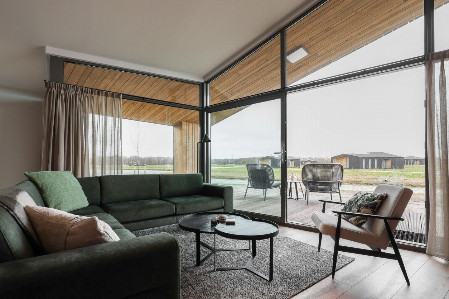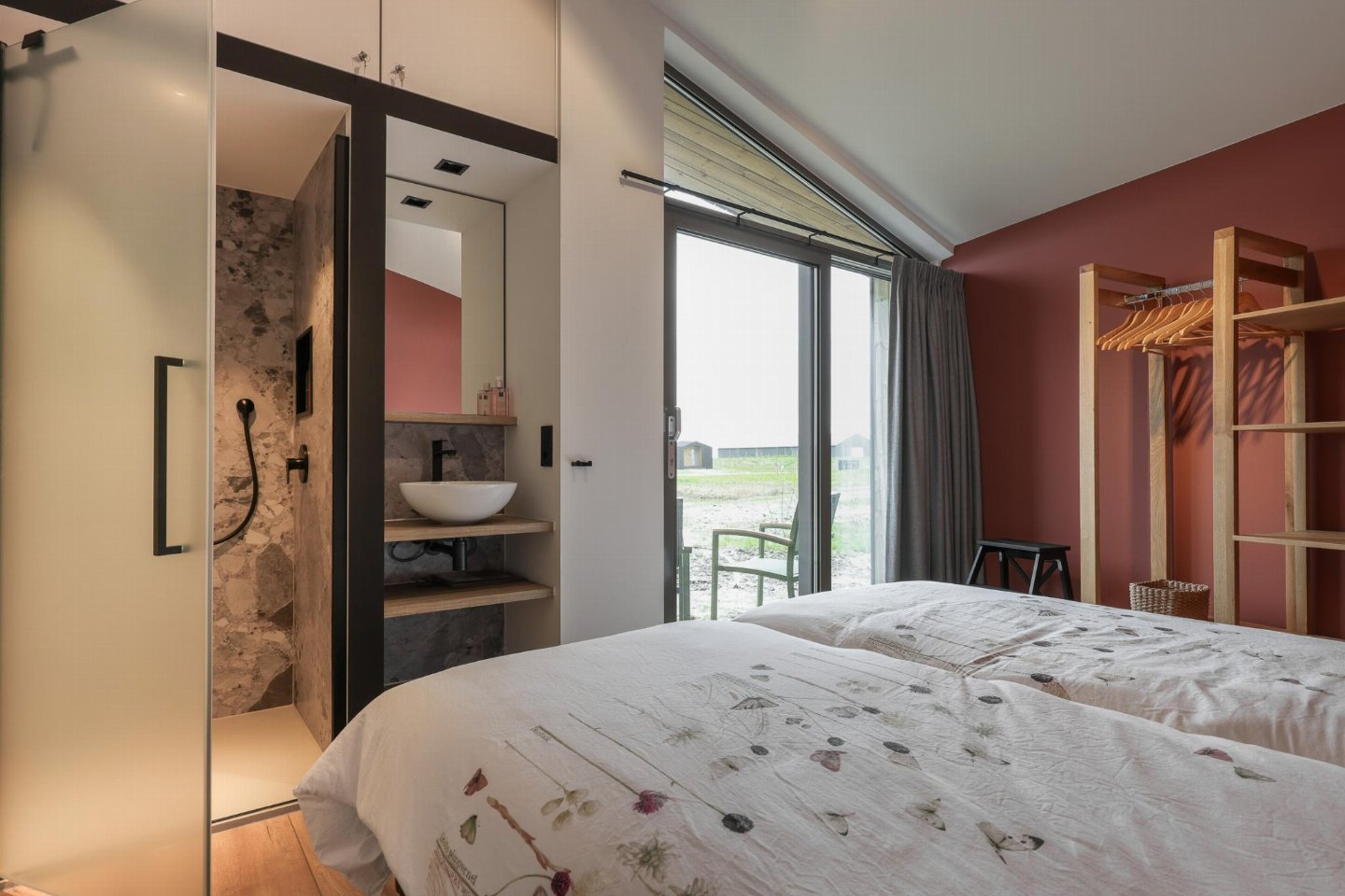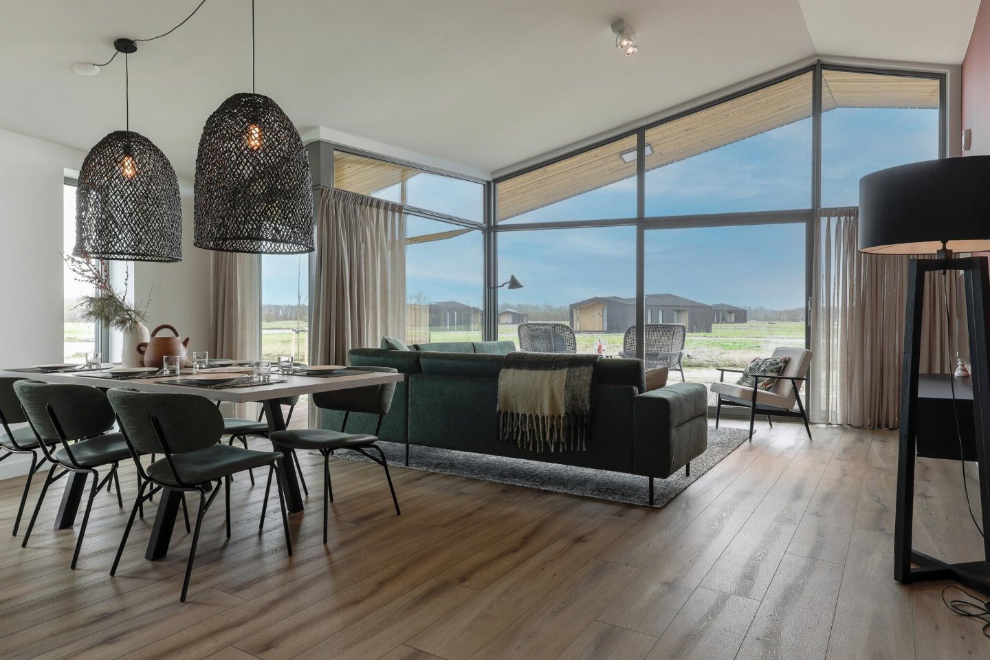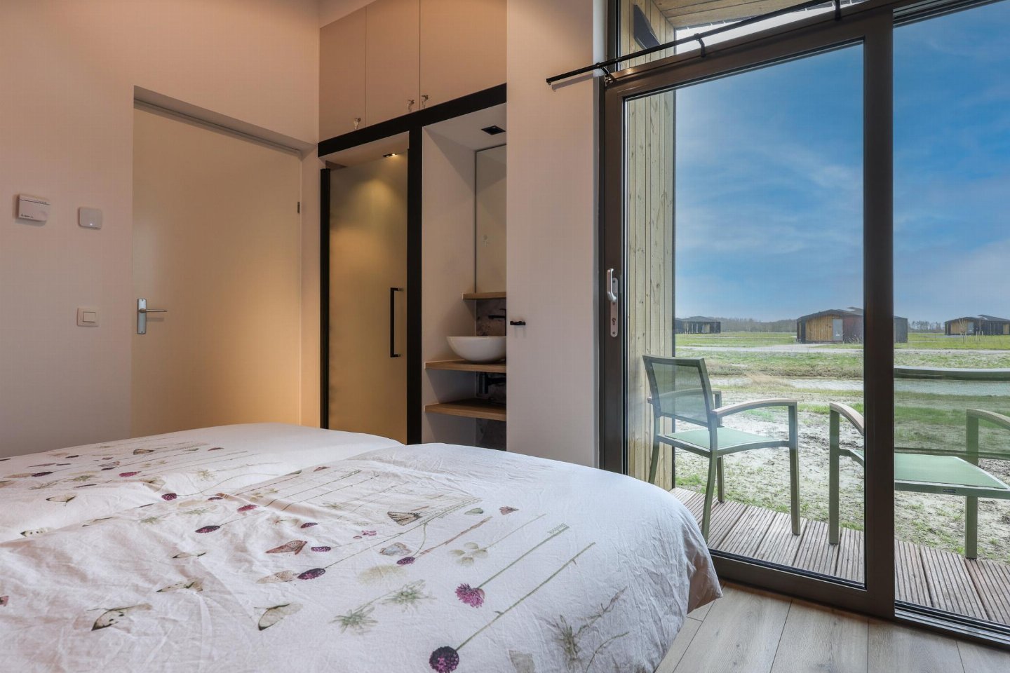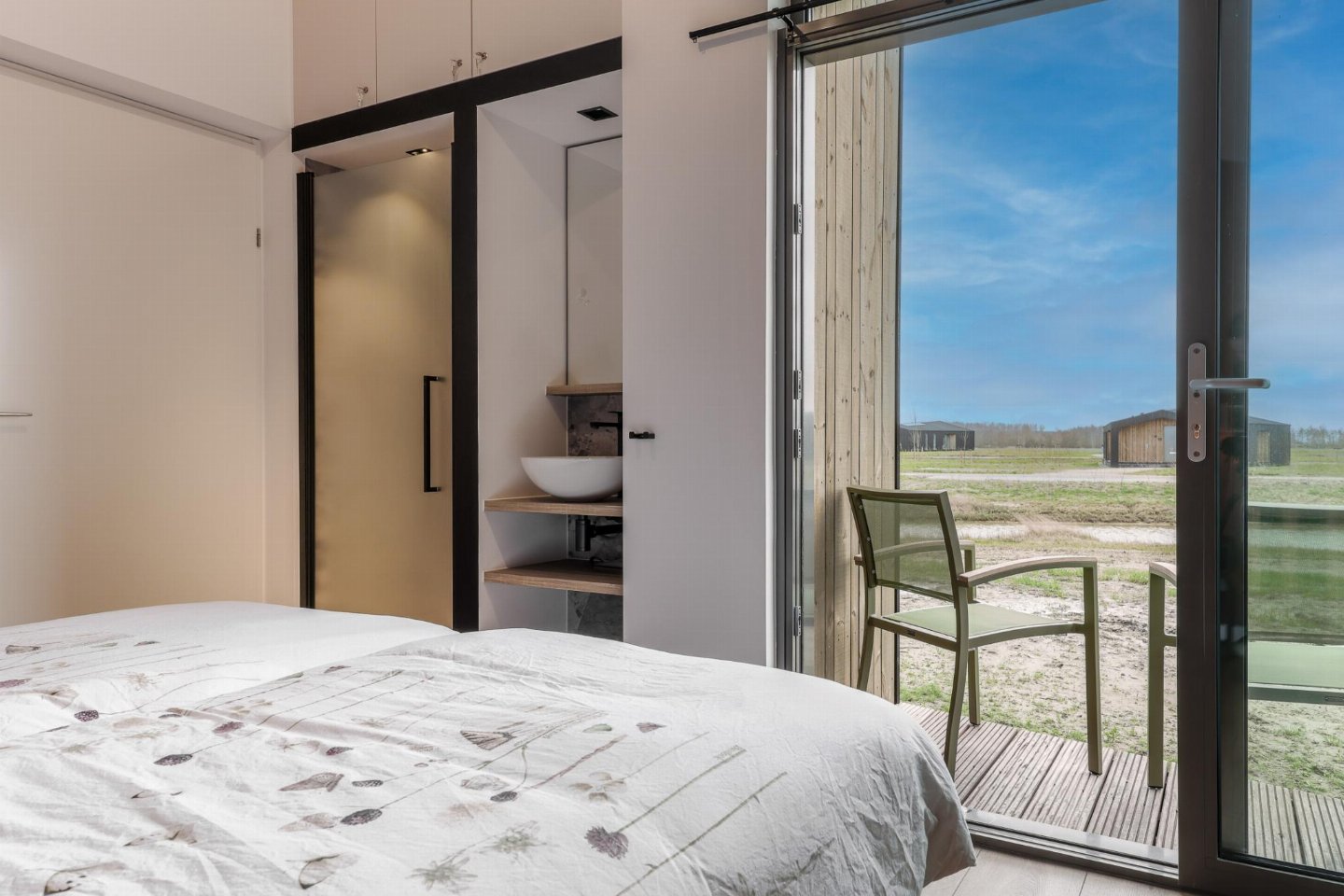 Vrijstaand natuurhuis met woonkamer en open keuken en uitzicht op de waterpartij. Beschikt over 3 slaapkamers en twee badkamers: één ensuite met douche en wastafel en één met douche, wastafel en toilet, plus een separaat toilet in de hal.