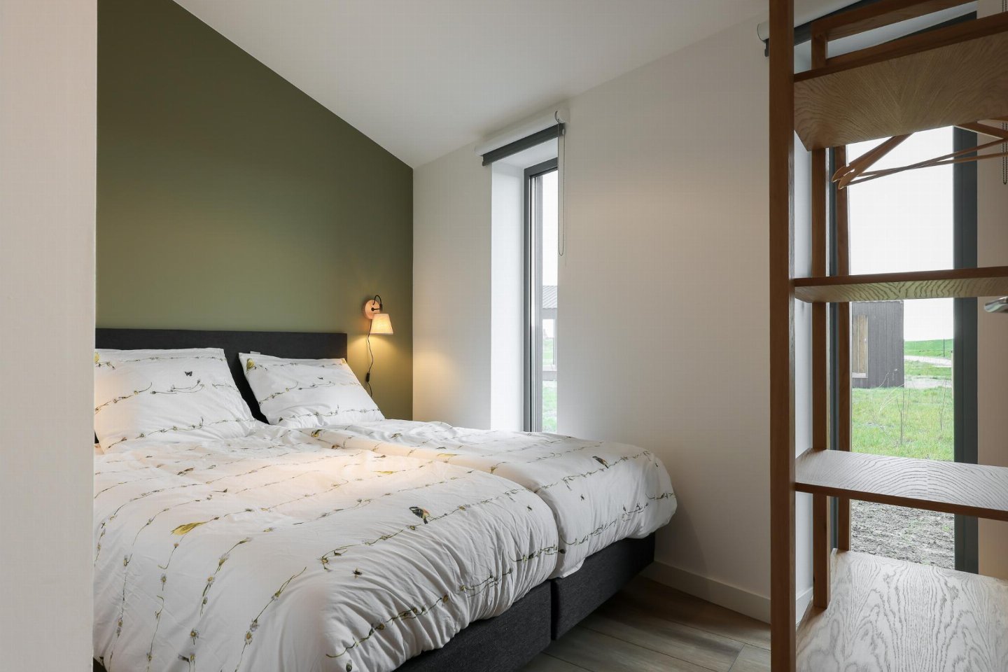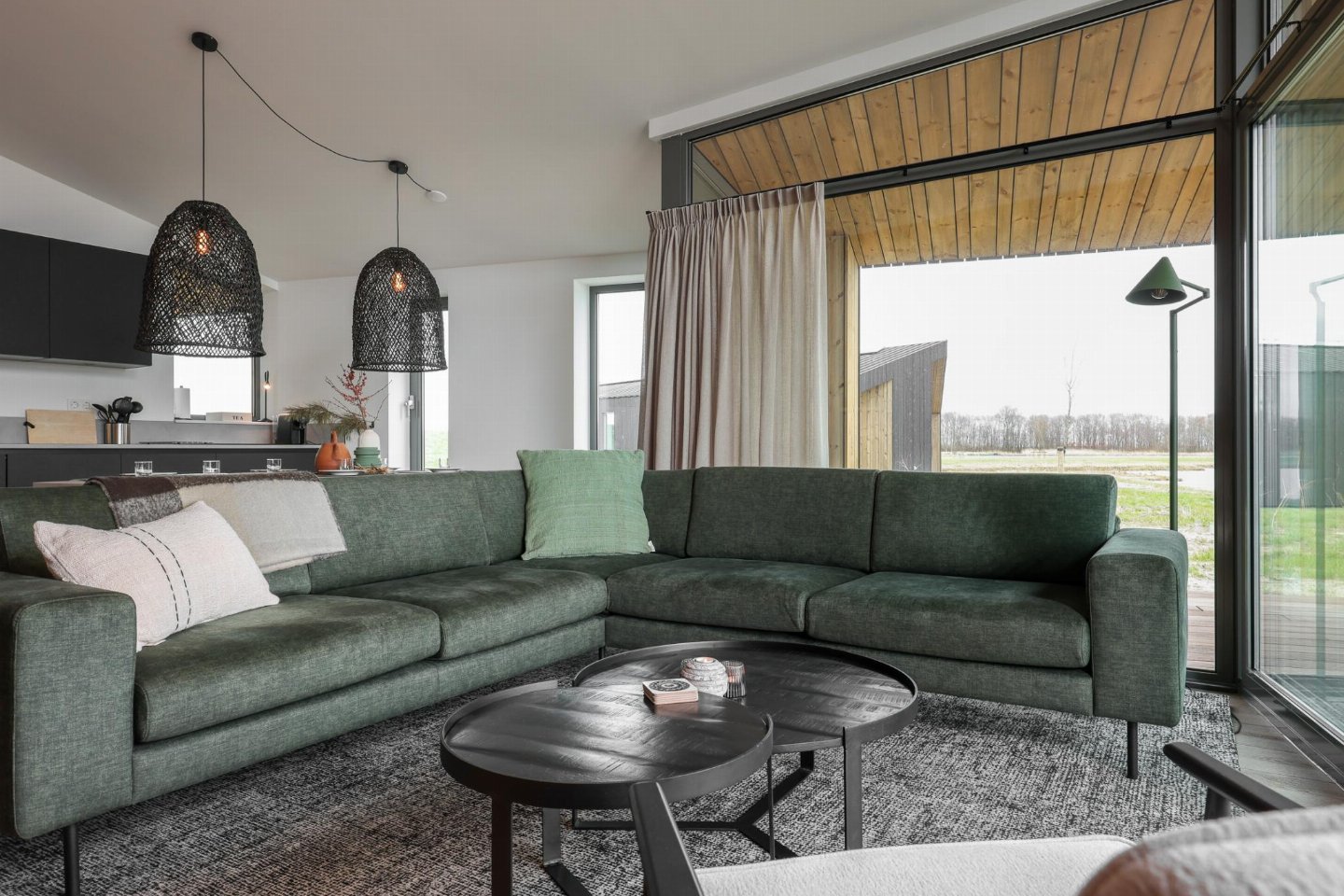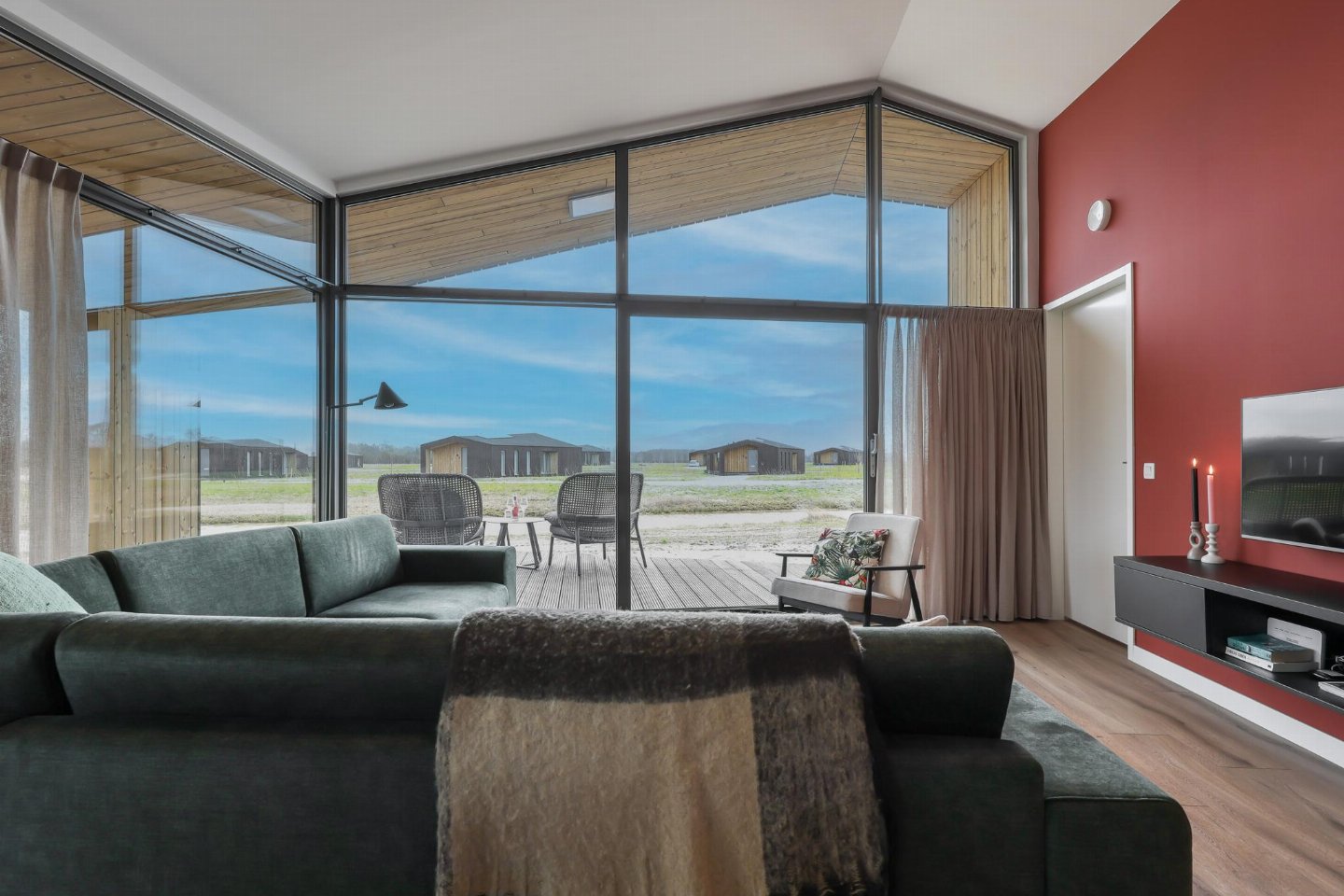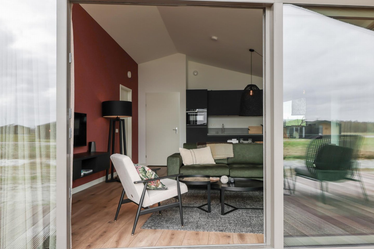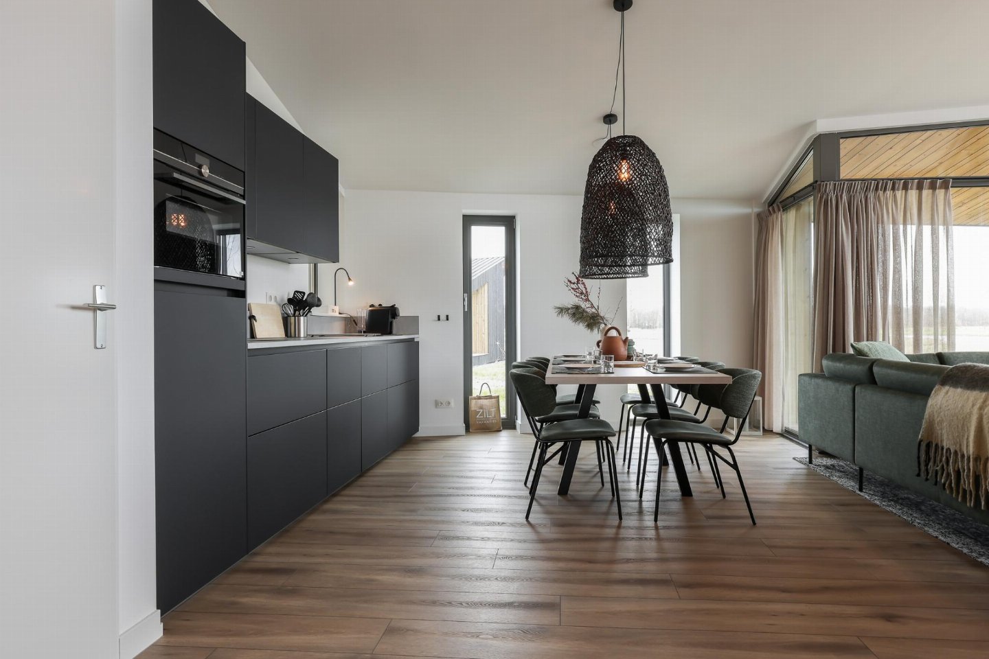 Vrijstaand natuurhuis met woonkamer en open keuken en uitzicht op de waterpartij. Beschikt over 3 slaapkamers en twee badkamers: één ensuite met douche en wastafel en één met douche, wastafel en toilet, plus een separaat toilet in de hal.