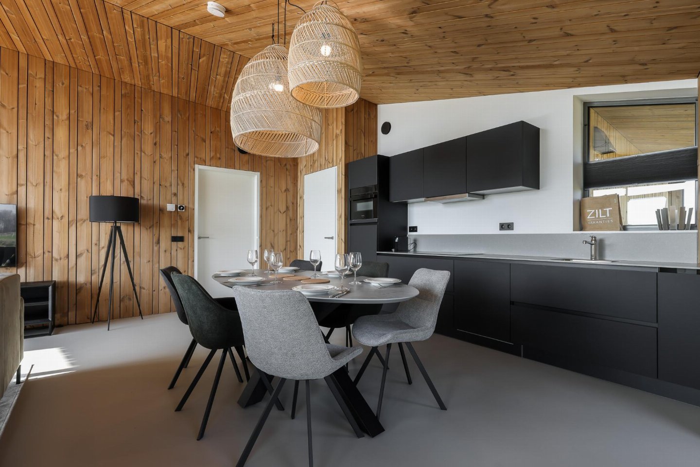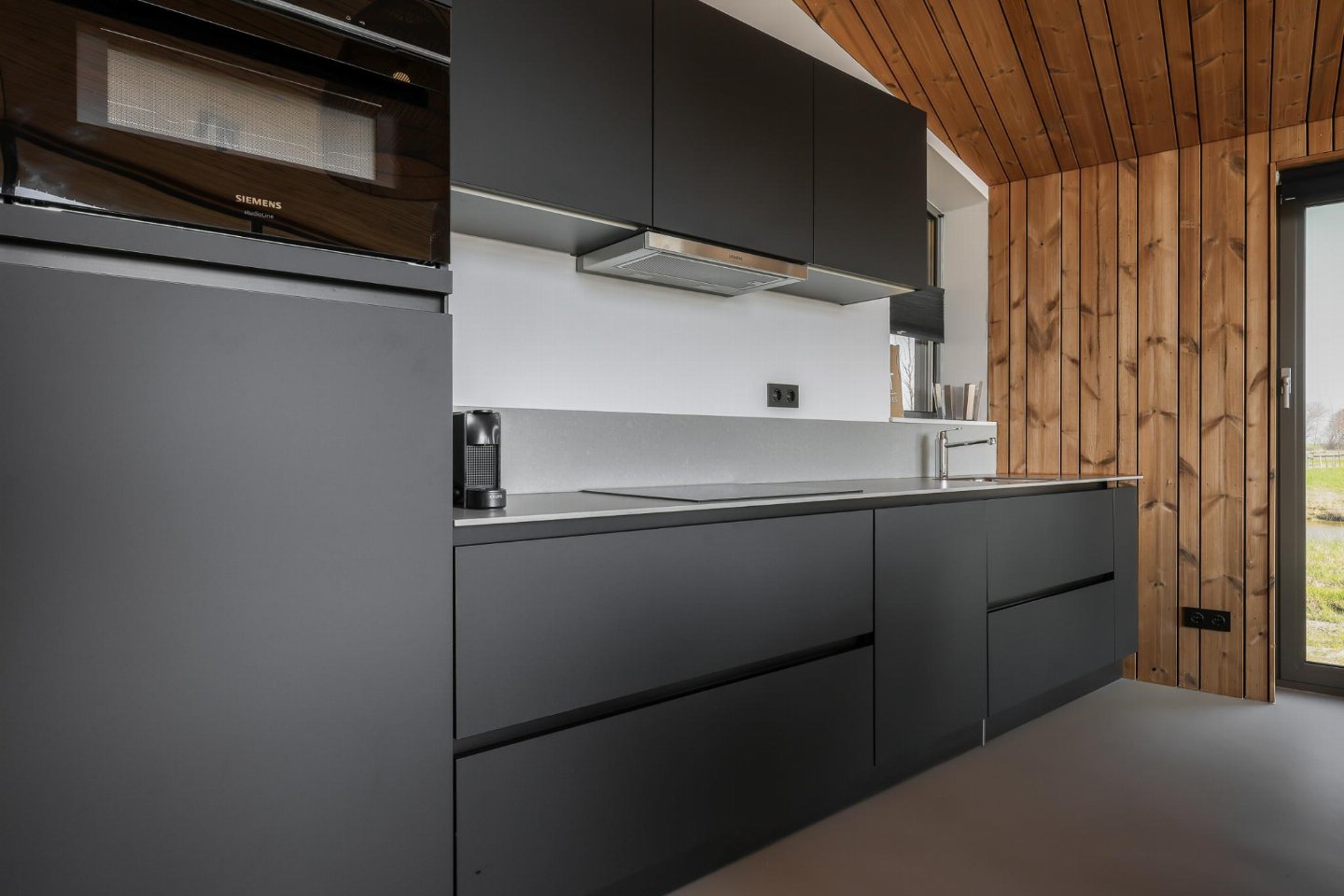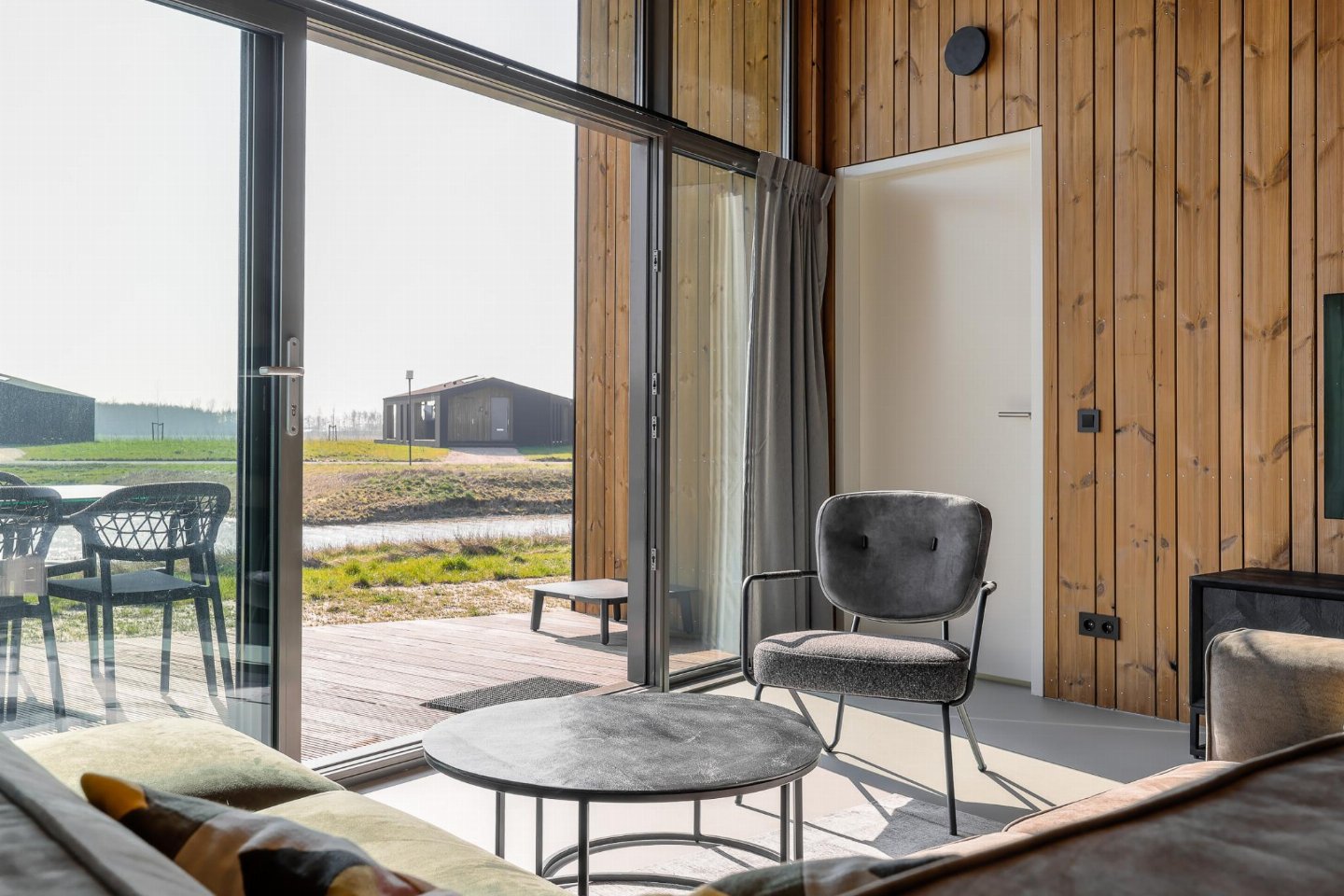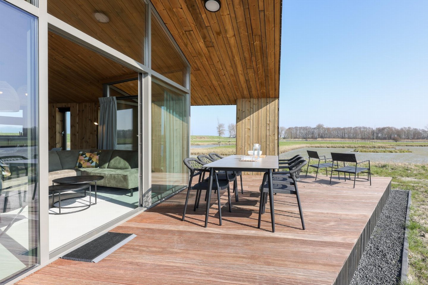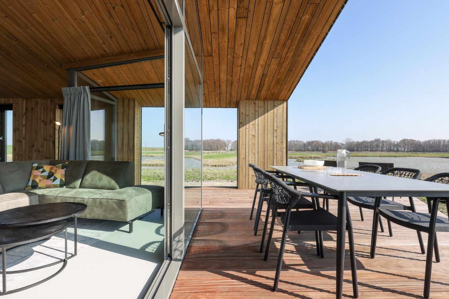 Vrijstaand natuurhuis met woonkamer en open keuken. Beschikt over 3 slaapkamers en twee badkamers: één met douche, wastafel en toilet en één met douche en wastafel, plus een separaat toilet in de hal. Via de schuifpui bereik je direct het grote overdekte terras met uitzicht op de waterpartij.