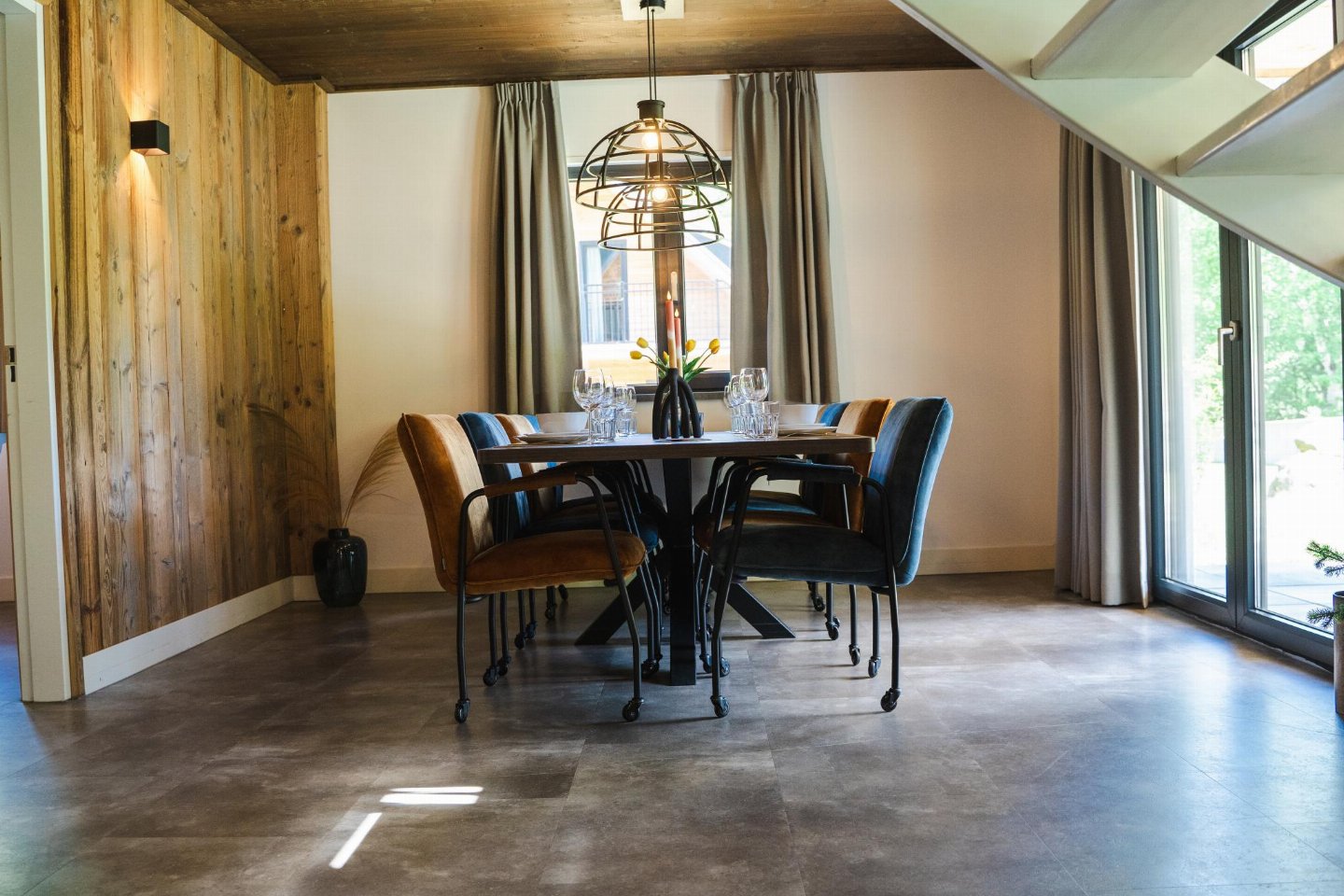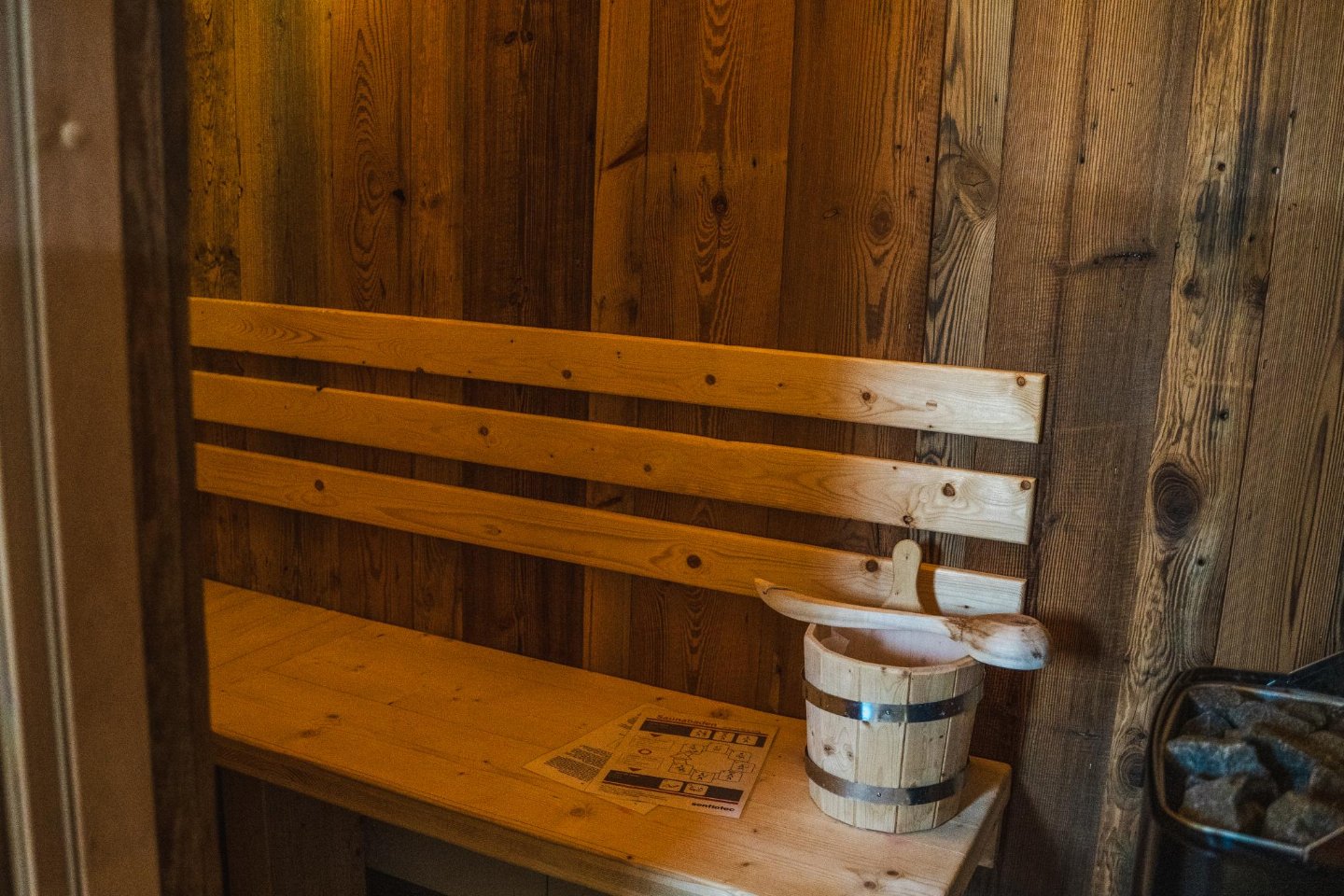 Begane grond(eigen entree): hal, open keuken met kookplaat(4 kookplaten, inductie), waterkoker, afzuigkap, koffiezetapparaat(nespresso cups), combimagnetron, afwasmachine, koel-/vriescombinatie , woon/eetkamer met TV(flatscreen, smart TV), eettafel(8 personen), zithoek , slaapkamer met 2-pers. bed(180 x 210 cm) , badkamer met douche(inloopdouche, Regen), wastafel , toilet met wastafel, wc , skiberging(buitenom bereikbaar), sauna(privé), terras(privé, overdekt, verlicht, 45 m2) met eettafel