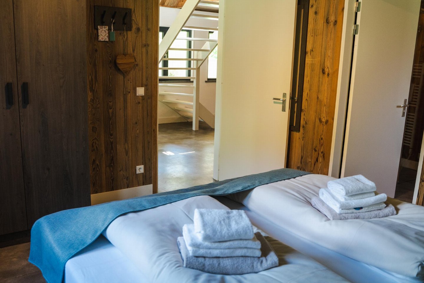 Op de 1e etage: slaapkamer met 2-pers. bed(180 x 200 cm) , slaapkamer met 2-pers. bed(180 x 200 cm) , slaapkamer met 1-pers. bed(90 x 200 cm), 1-pers. bed(90 x 200 cm) , badkamer met douche(inloopdouche, Regen), wastafel, wc , balkon