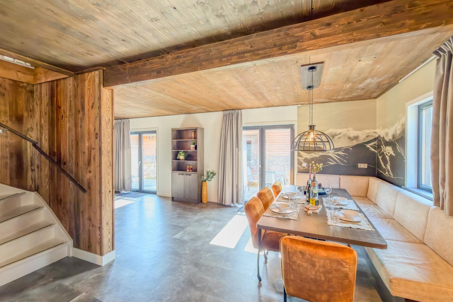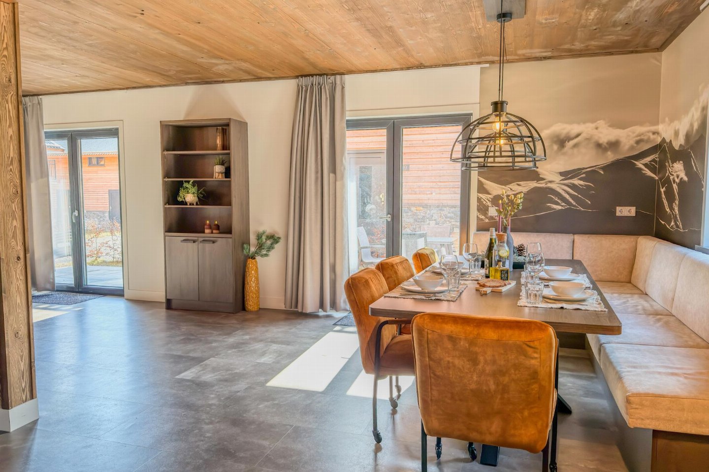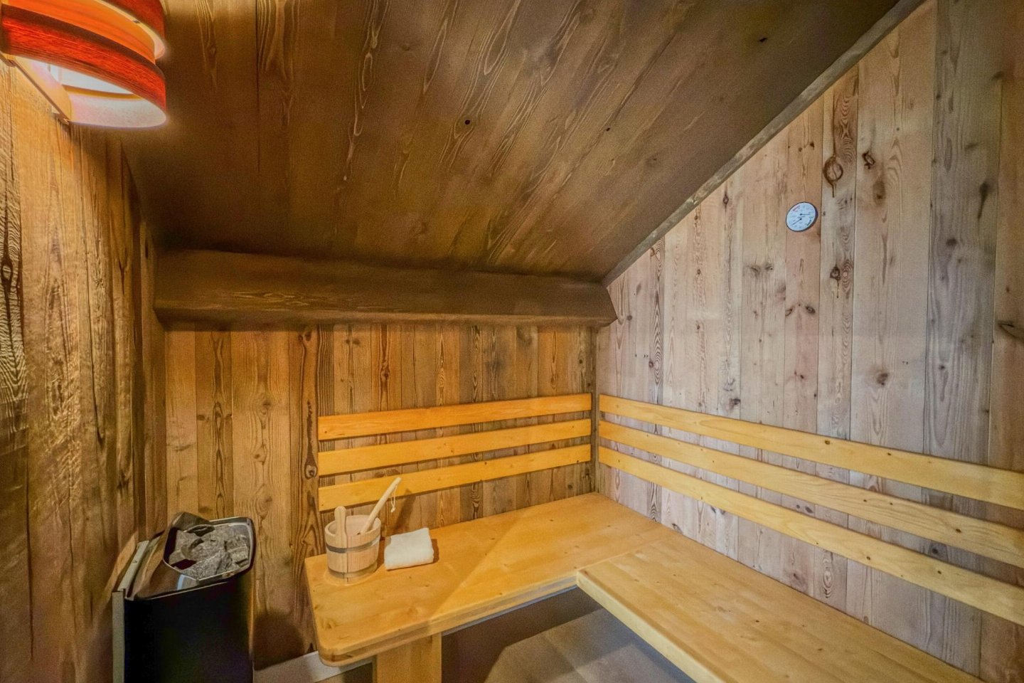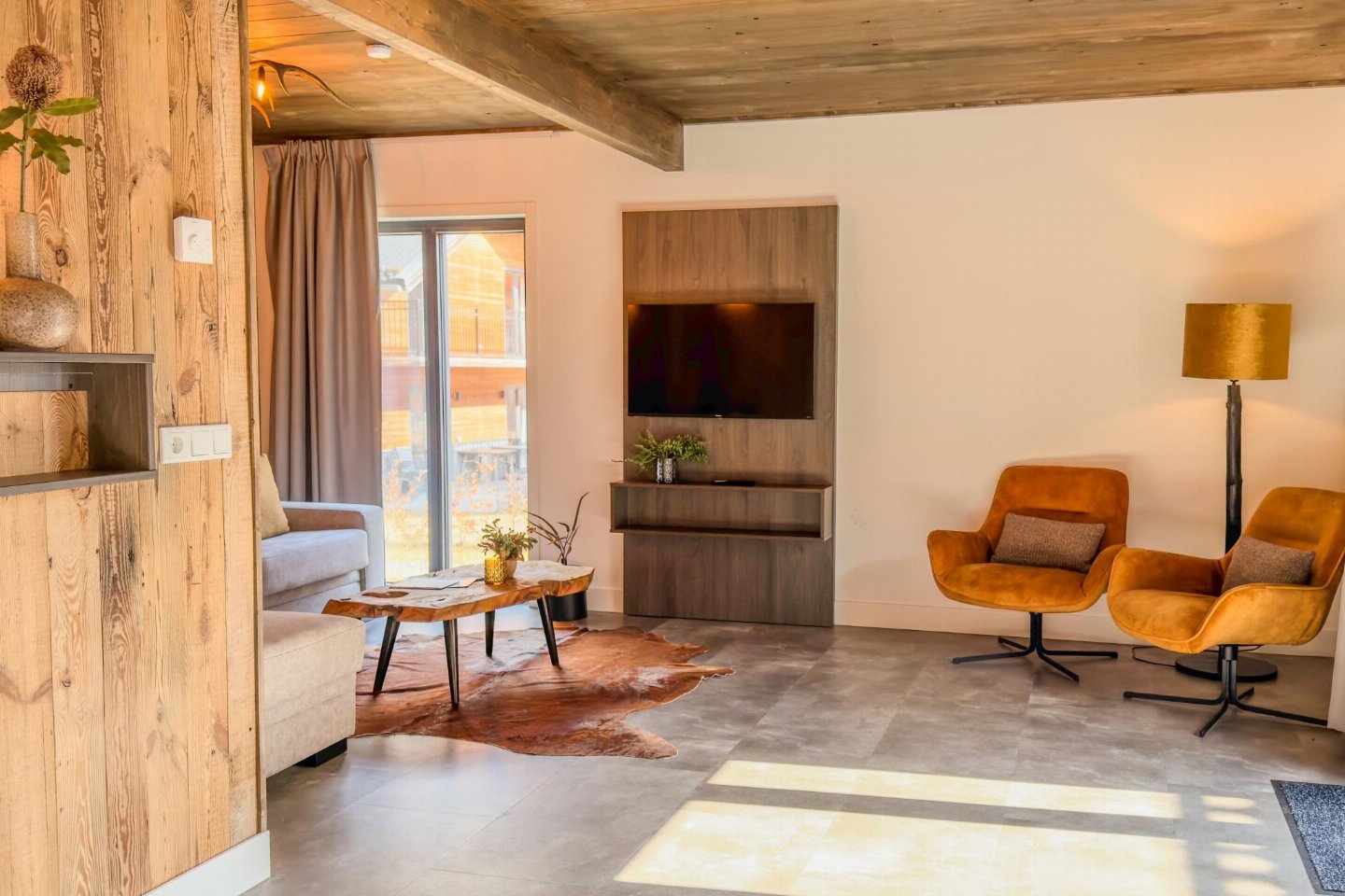 Begane grond(eigen entree): hal met stofzuiger , open keuken met kookplaat(4 kookplaten, inductie), waterkoker, afzuigkap, koffiezetapparaat(nespresso cups), combimagnetron, afwasmachine, koel-/vriescombinatie , woon/eetkamer met 2-pers. slaapbank(160 x 200 cm), TV(flatscreen, smart TV), eettafel(8 personen) , badkamer met douche(inloopdouche, Regen), wastafel , toilet met wastafel, wc , skiberging(buitenom bereikbaar), terras(privé, overdekt, verlicht, 25 m2)
