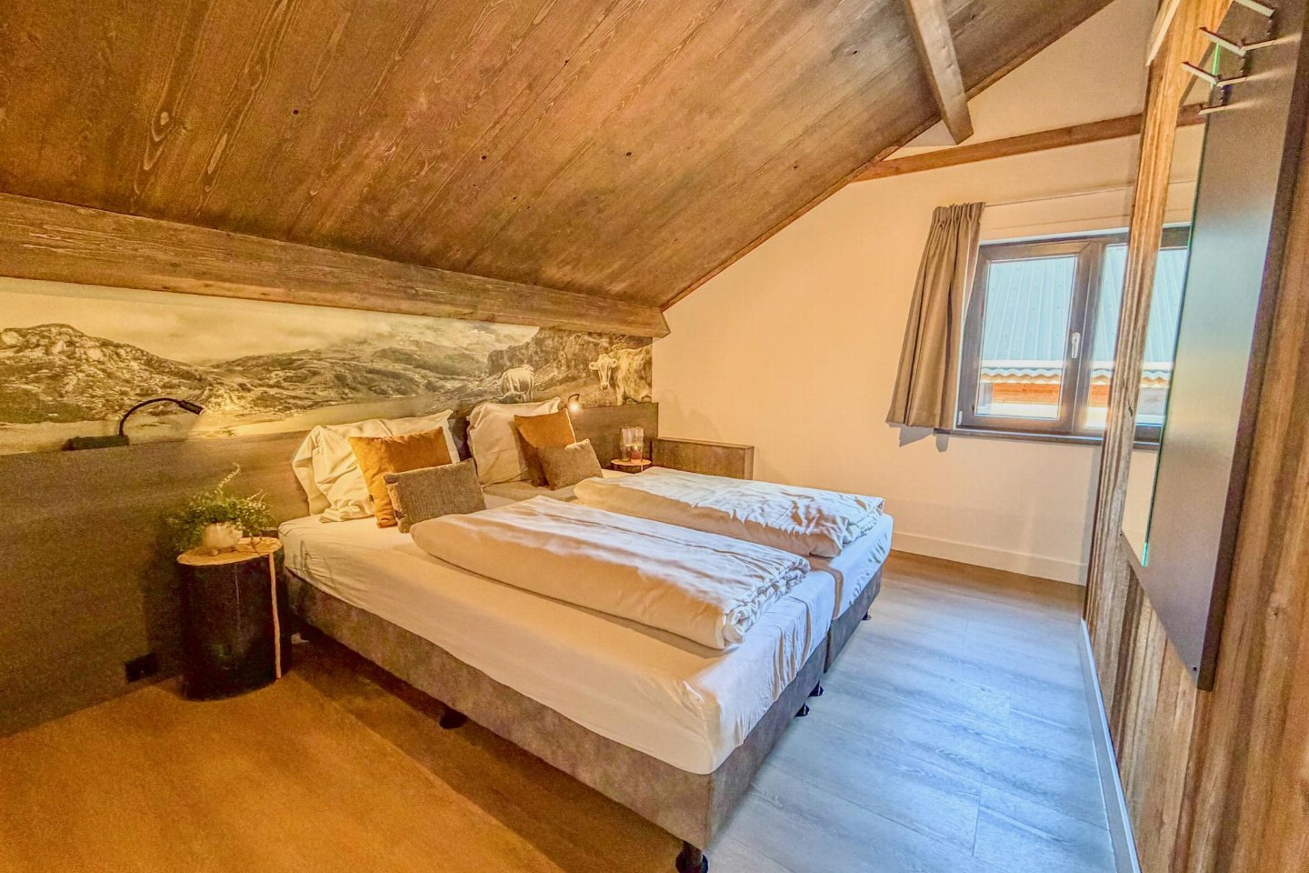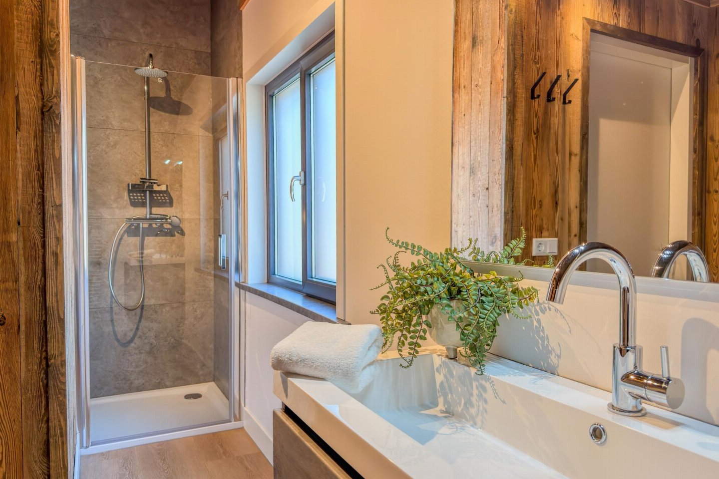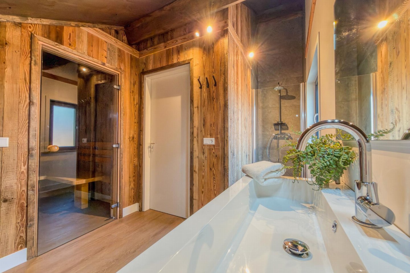 Op de 1e etage: slaapkamer met 2-pers. bed(180 x 200 cm) , slaapkamer met 2-pers. bed(180 x 200 cm) , slaapkamer met 1-pers. bed(90 x 200 cm), 1-pers. bed(90 x 200 cm) , badkamer met douche(inloopdouche, Regen), wastafel, wc , sauna(privé), balkon