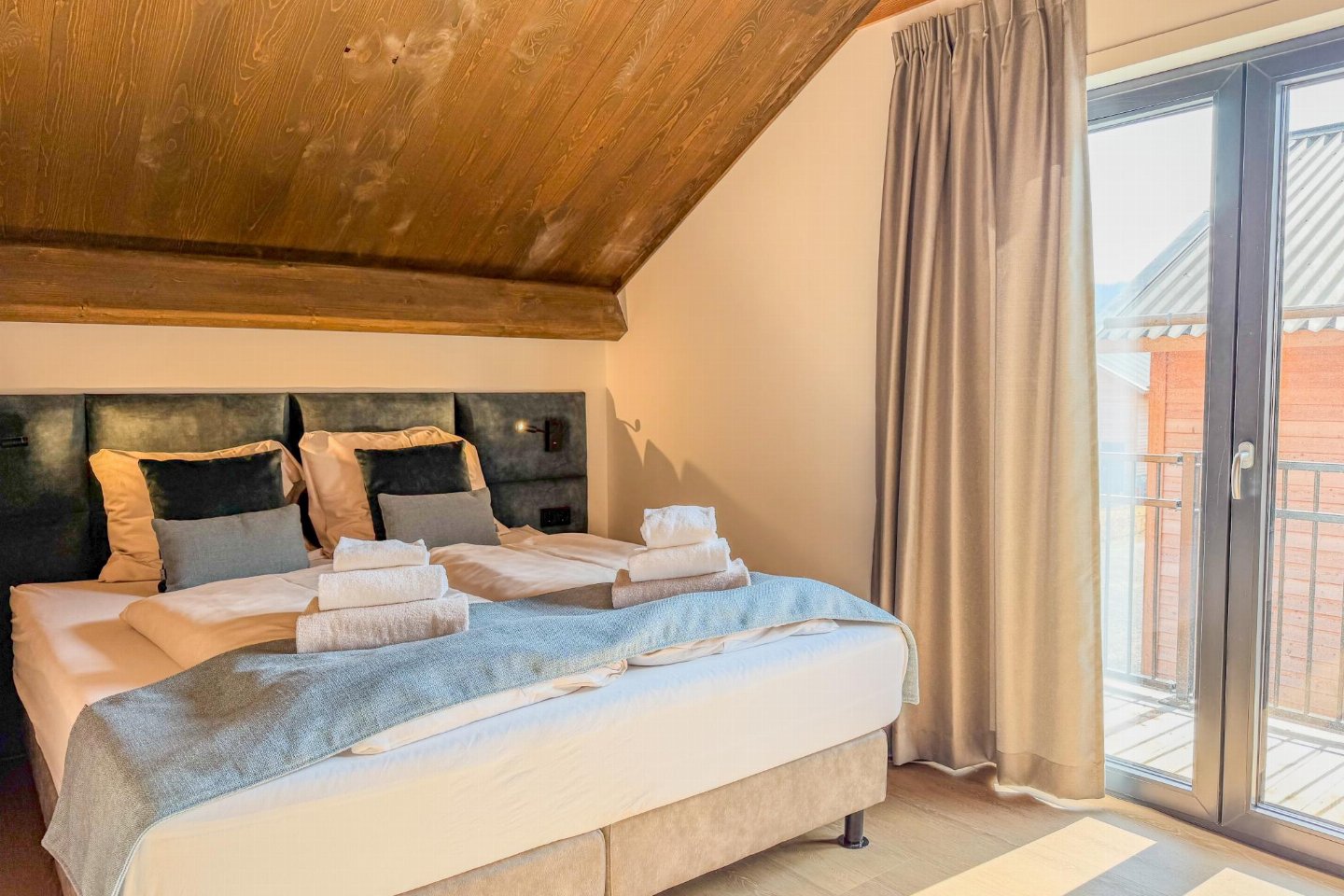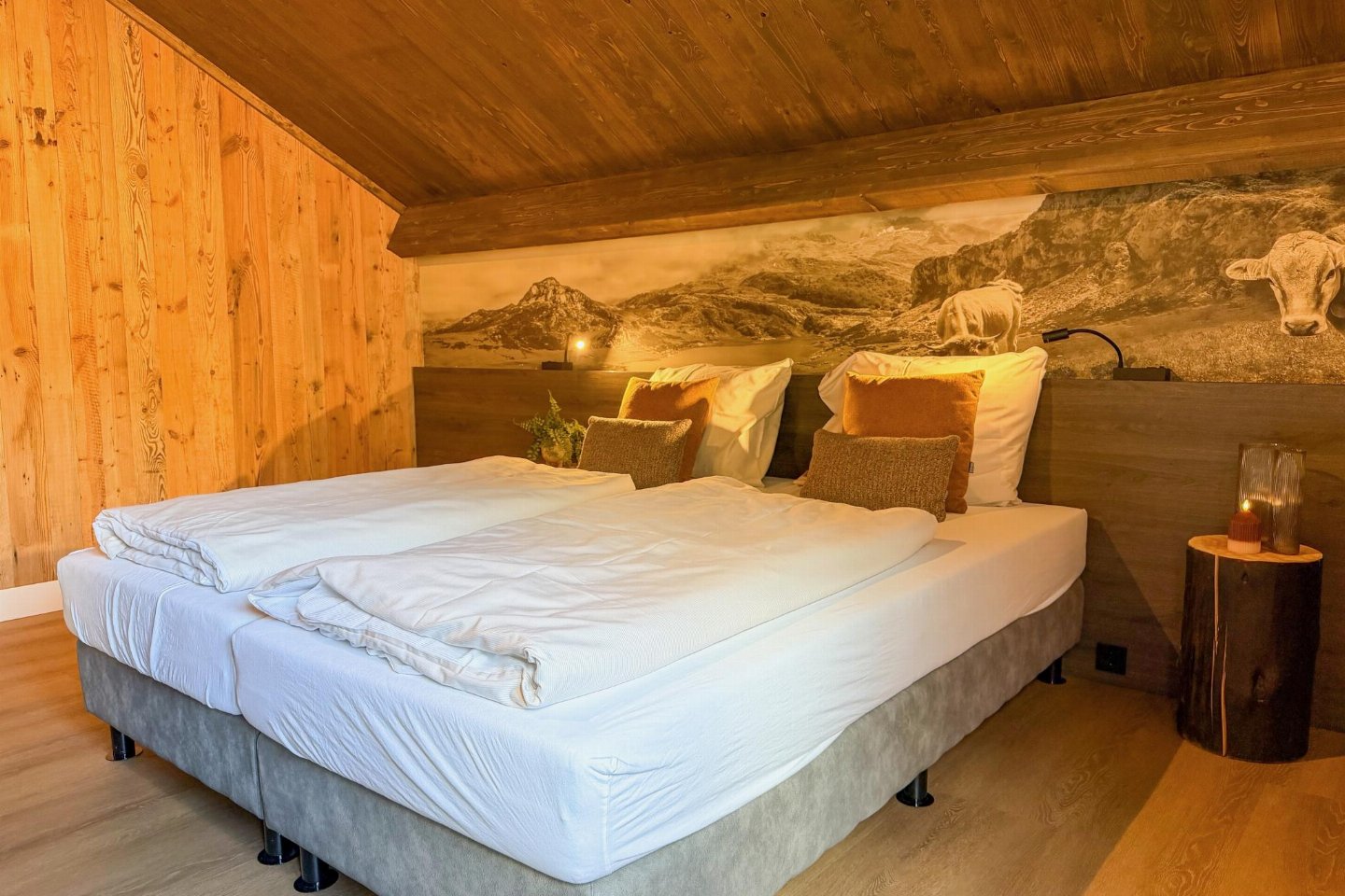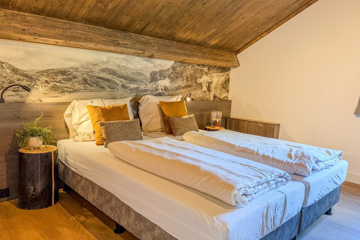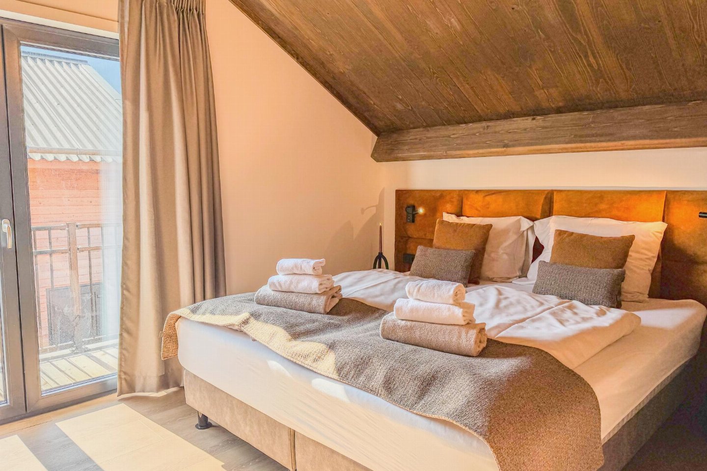 Op de 1e etage: slaapkamer met 2-pers. bed(180 x 200 cm) , slaapkamer met 2-pers. bed(180 x 200 cm) , slaapkamer met 1-pers. bed(90 x 200 cm), 1-pers. bed(90 x 200 cm) , badkamer met douche(inloopdouche, Regen), wastafel, wc , sauna(privé), balkon