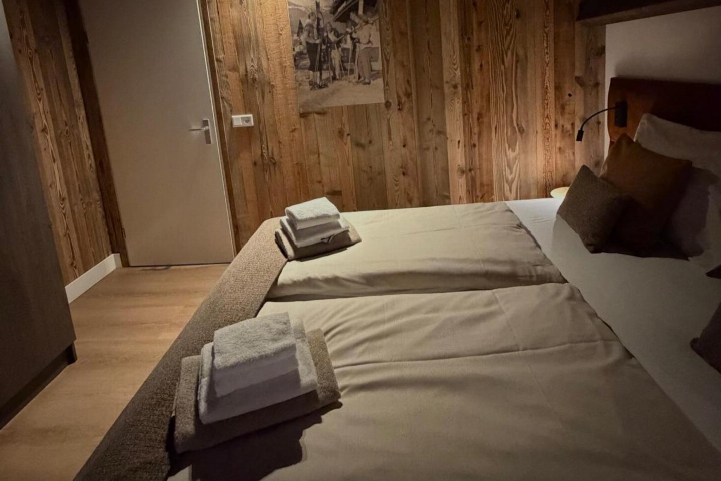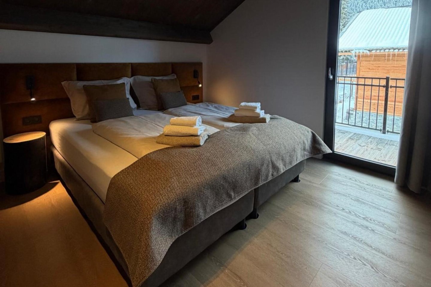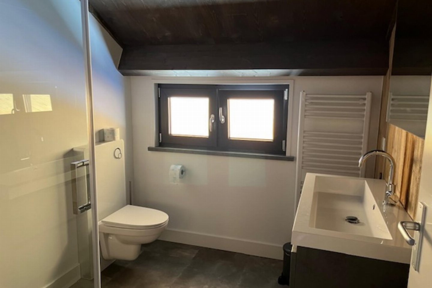 Op de 1e etage: slaapkamer met 2-pers. bed(180 x 200 cm) , slaapkamer met 2-pers. bed(180 x 200 cm) , badkamer met douche, wastafel, wc , sauna(privé), balkon