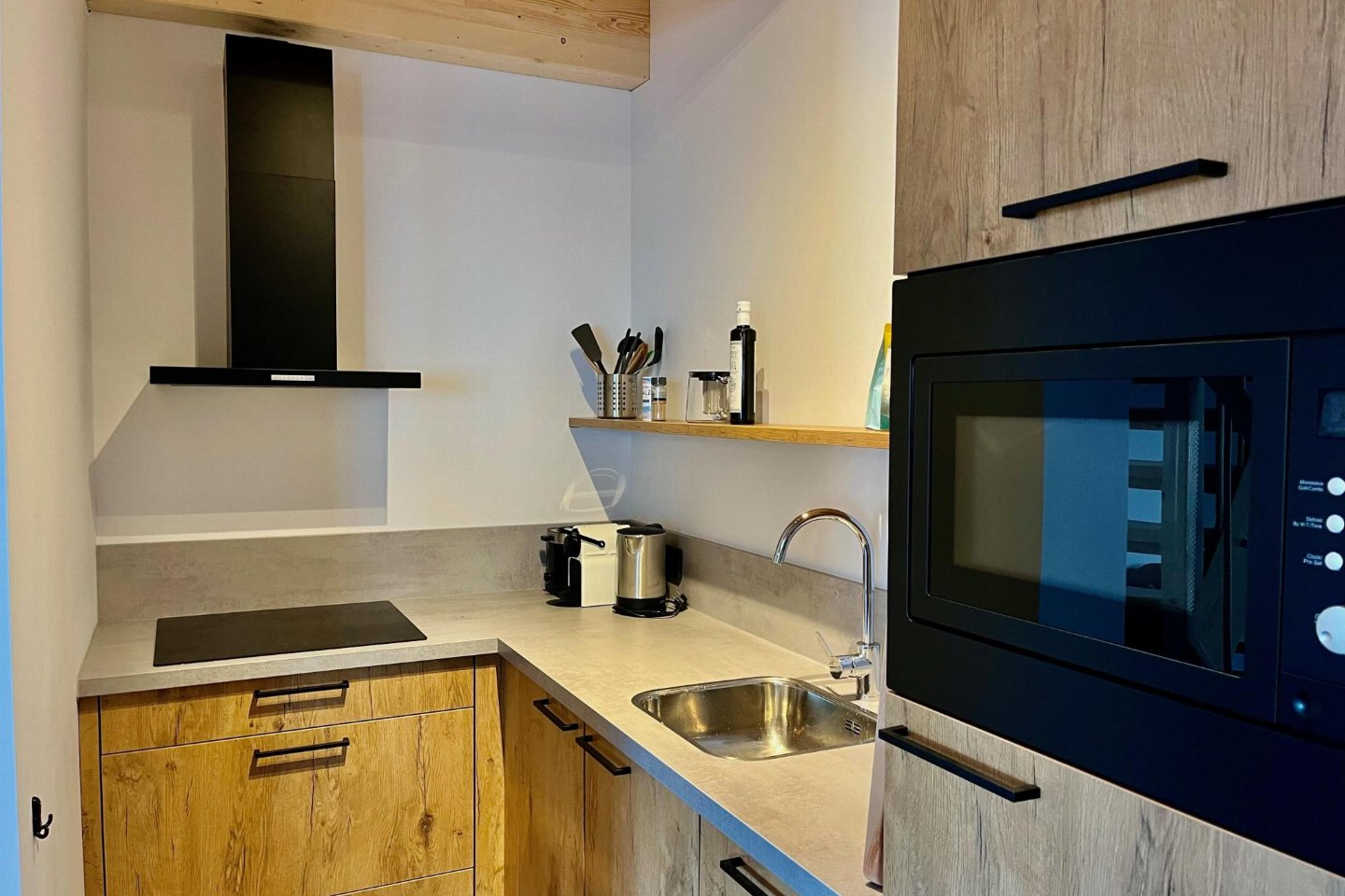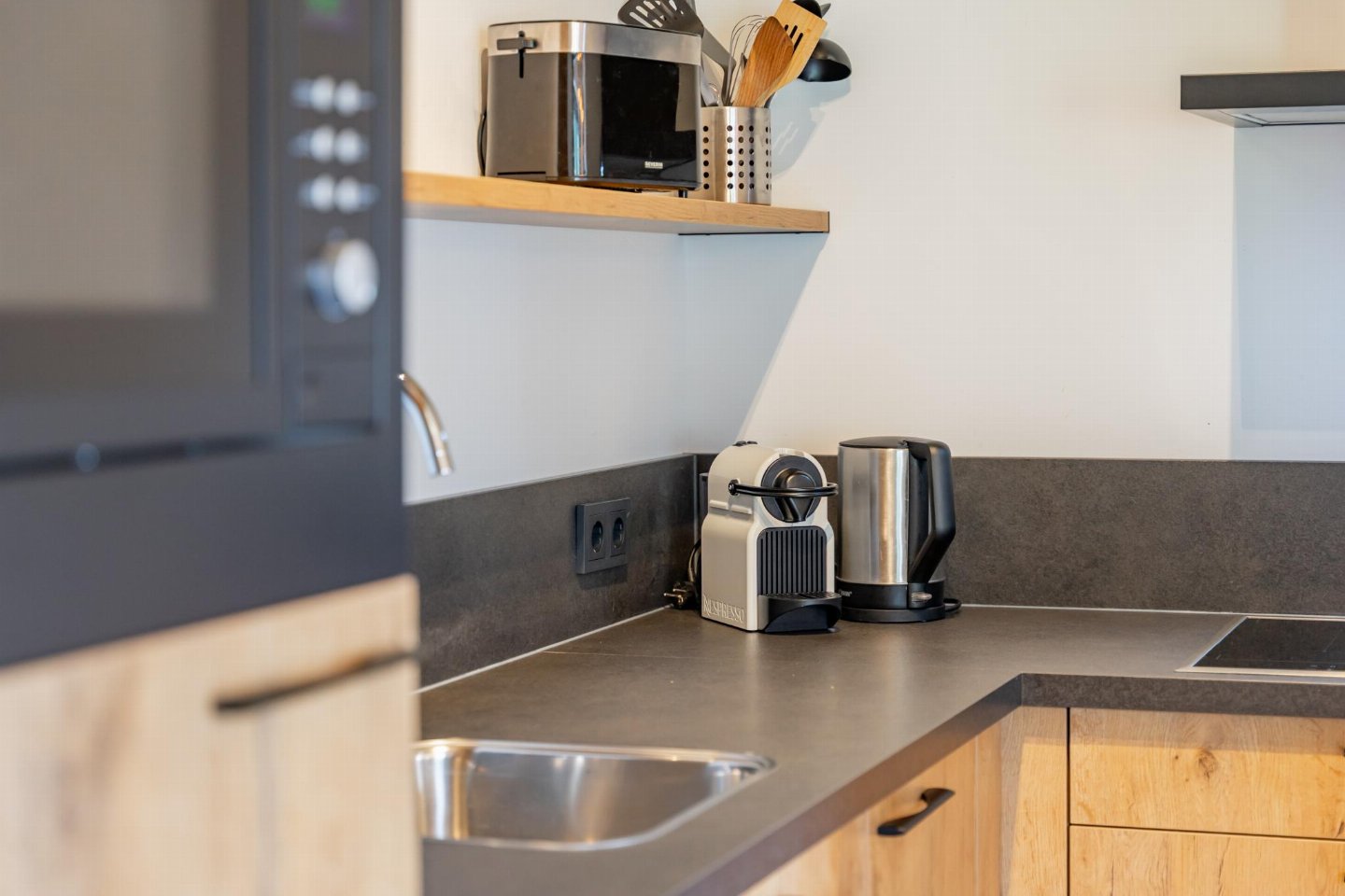 Begane grond: woonkamer met TV, eettafel(6 personen), zithoek , open keuken met kookplaat, waterkoker, afzuigkap, koffiezetapparaat(filtermaling), oven, afwasmachine, koel-/vriescombinatie , toilet met wastafel, wc , terras(privé)