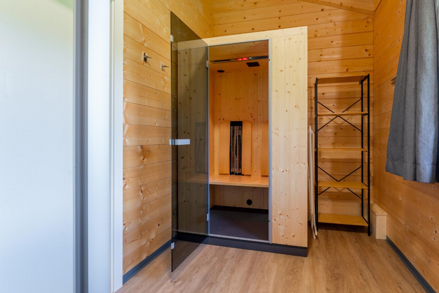 Op de 1e etage: slaapkamer met 2-pers. bed, TV , slaapkamer met 2-pers. bed, TV , slaapkamer met 2-pers. bed , badkamer met douche, infraroodsauna(2 personen), wastafel , 2x balkon
