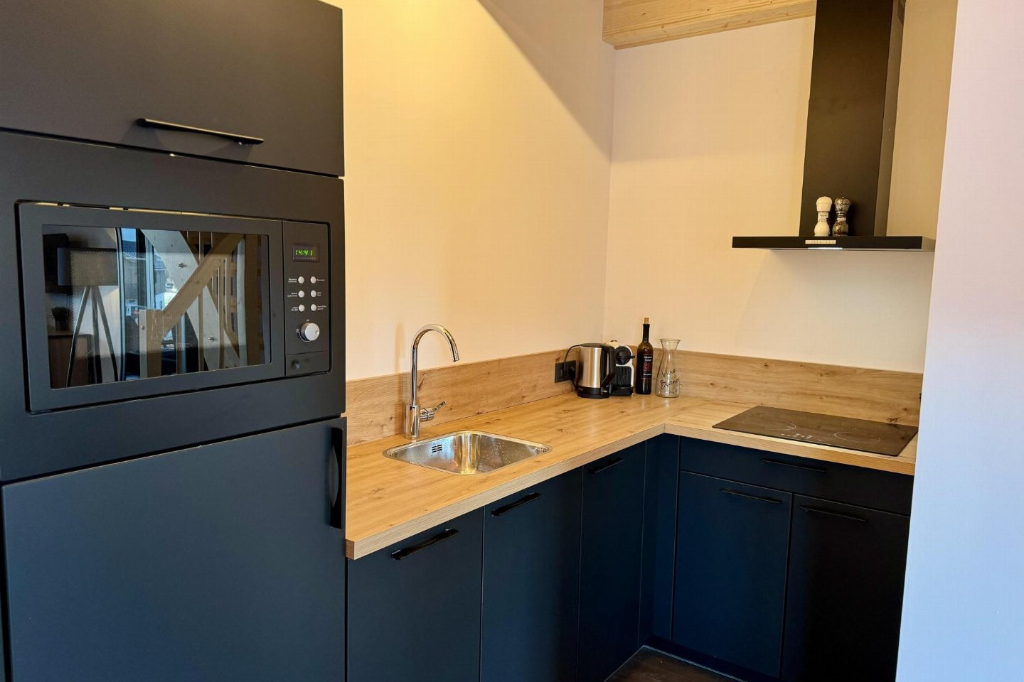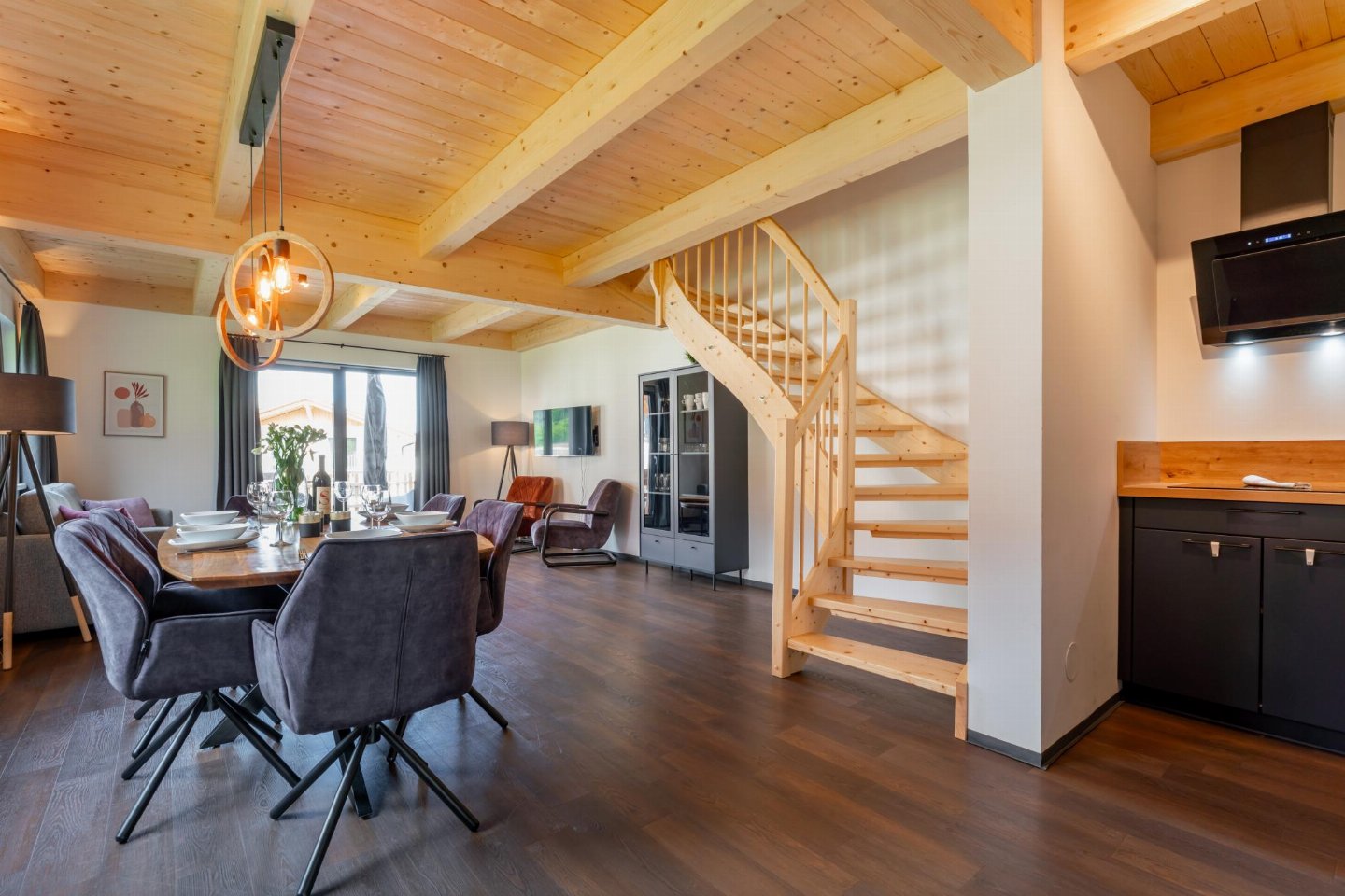 Begane grond: woonkamer met TV, eettafel(6 personen), zithoek , open keuken met kookplaat, waterkoker, afzuigkap, koffiezetapparaat(filtermaling), oven, afwasmachine, koel-/vriescombinatie , toilet met wastafel, wc , terras