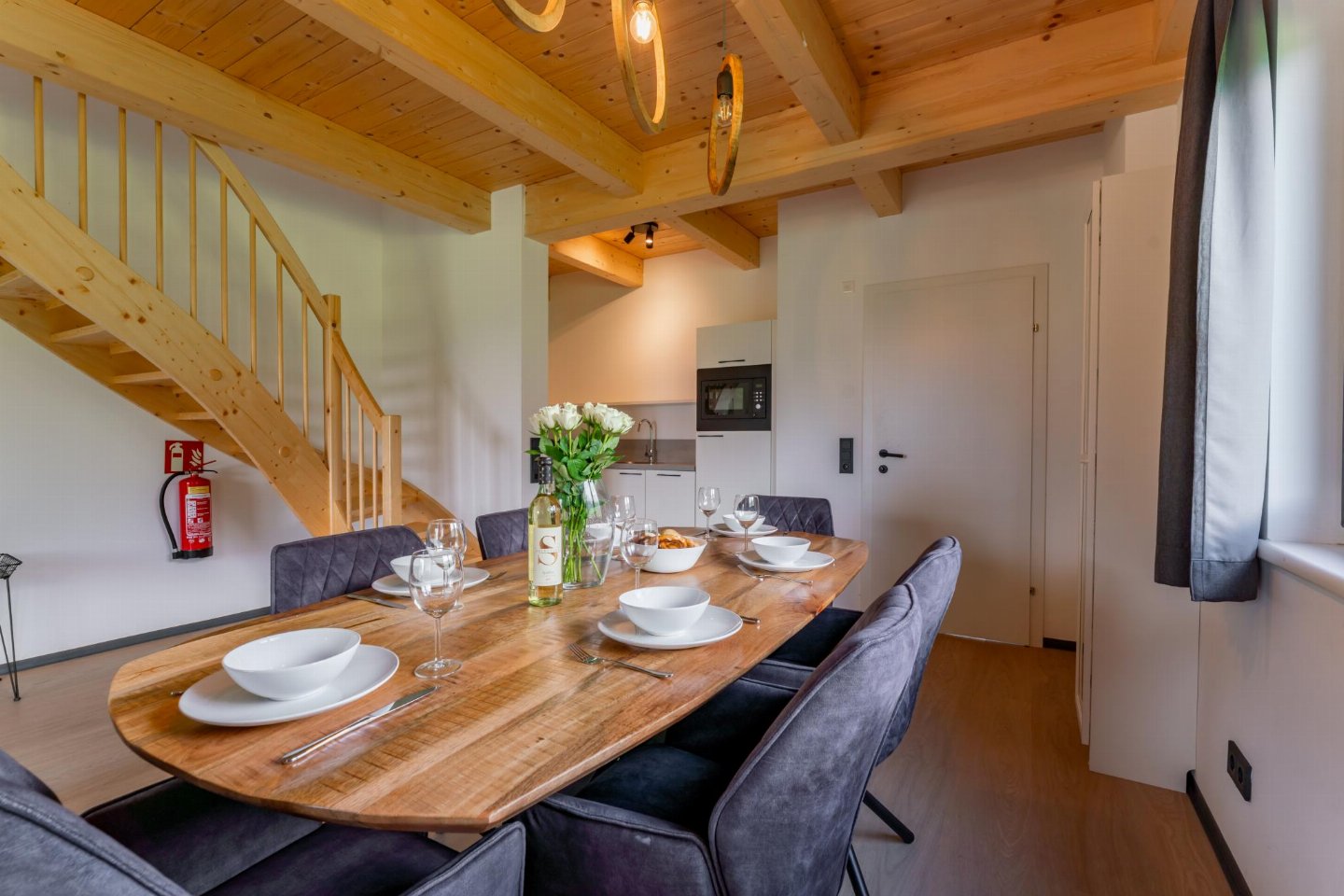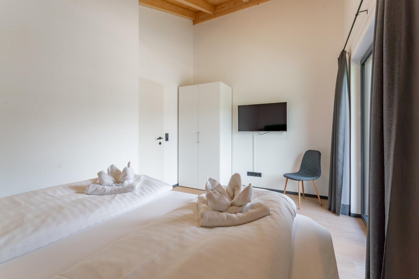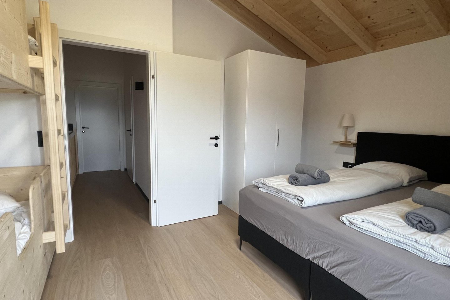 Op de 1e etage: slaapkamer met 2-pers. bed, TV , slaapkamer met 2-pers. bed, stapelbed, TV , badkamer met douche, wastafel, wc , relaxruimte met sauna(privé) , 2x balkon