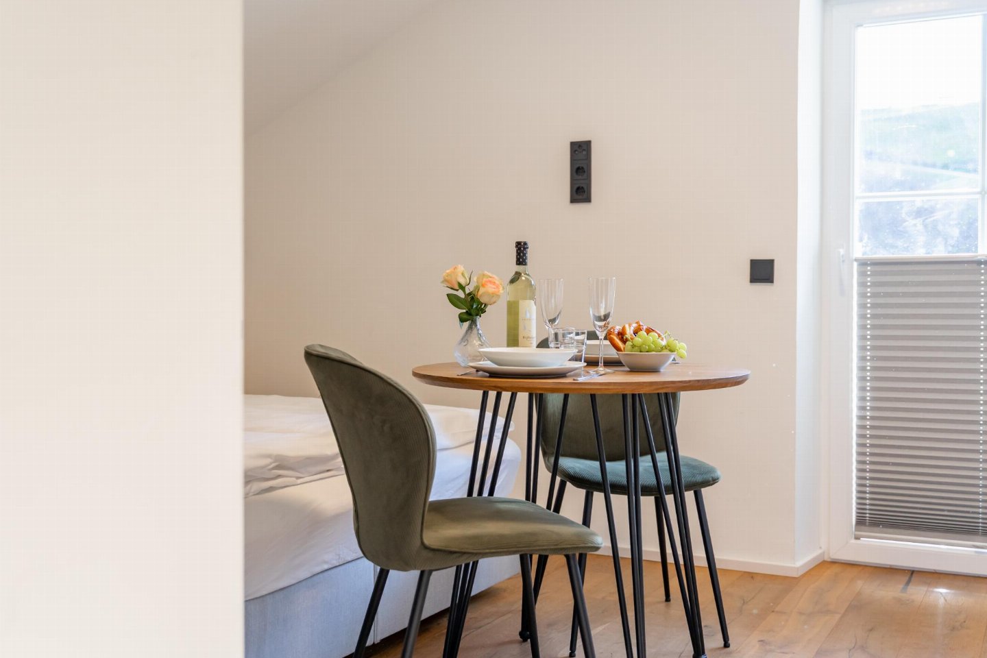 Op de 2e etage: (open keuken met waterkoker, fornuis (4 kookplaten, elektrisch), combimagnetron, afwasmachine, koelkast), woon/slaapkamer (2-pers. bed (160 x 200 cm), TV, eettafel (2 personen)), badkamer (douche, wastafel, wc, haardroger)