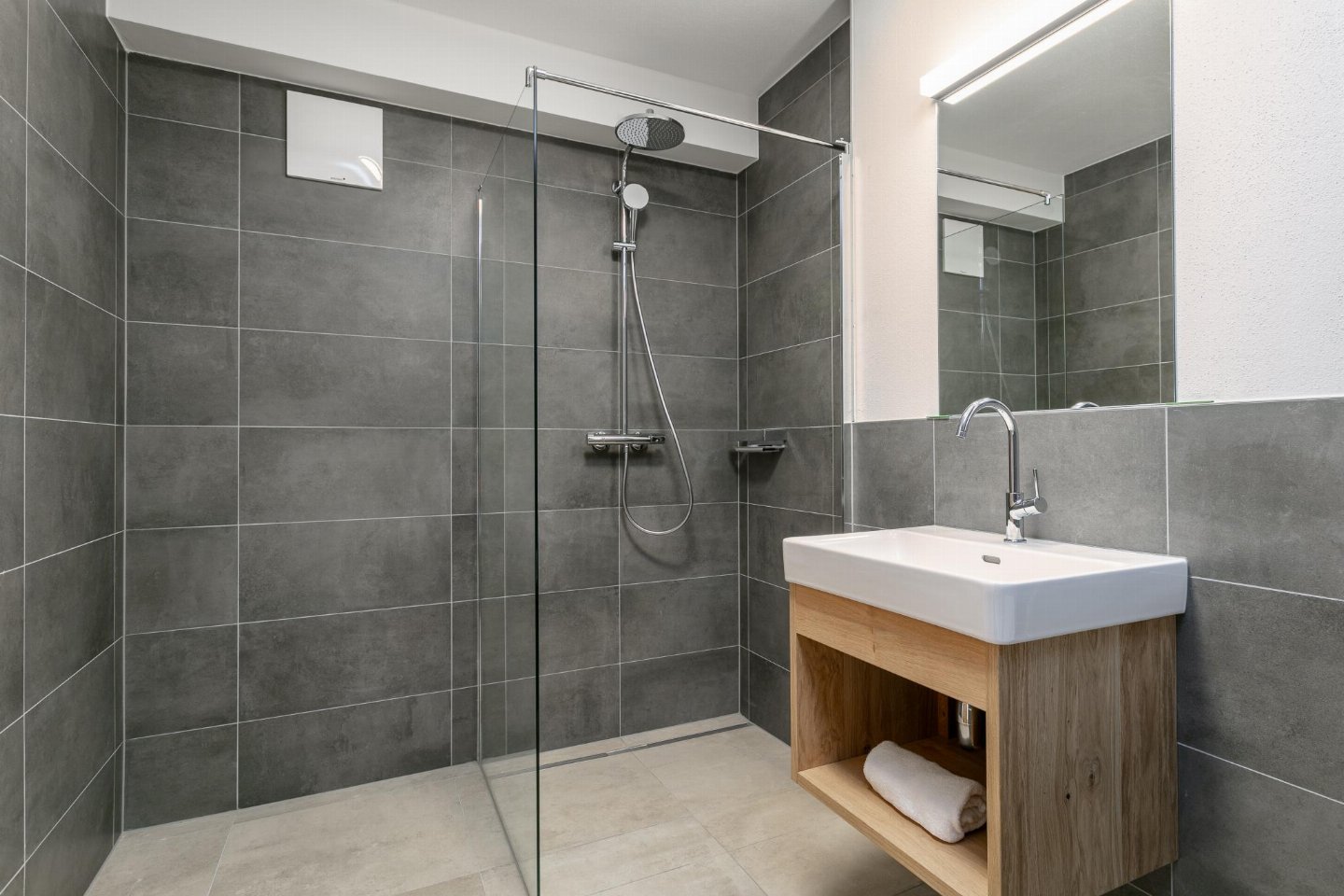 Begane grond: (hal, 2x slaapkamer met badkamer (2-pers. bed (180 x 200 cm), TV, douche, wastafel, wc, haardroger), slaapkamer met badkamer (2x 1-pers. hoogslaper (90 x 200 cm), 2-pers. bed (180 x 200 cm), TV, douche, wastafel, wc, haardroger), skiberging (skischoenverwarmers))
