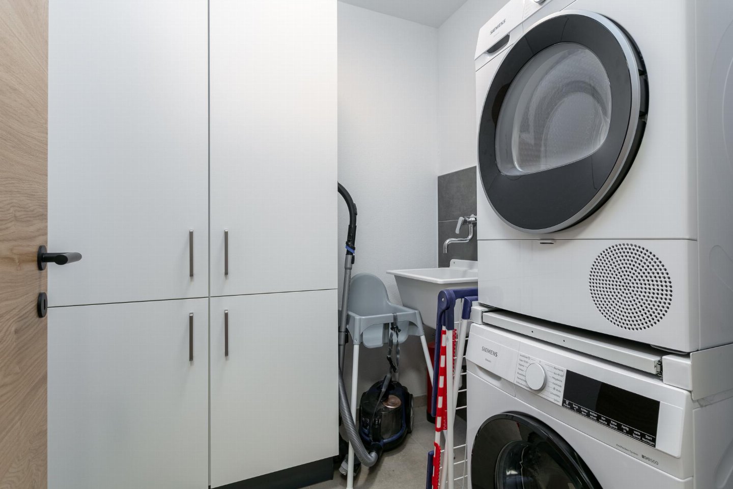 Op de 1e etage: (open keuken (waterkoker, kokend waterkraan, afzuigkap, koffiezetapparaat (filtermaling, nespresso cups), oven, magnetron, afwasmachine, koelkast, vriezer), woon/eetkamer (TV, eettafel (10 personen), zithoek (8 personen)), slaapkamer met badkamer (2-pers. bed (180 x 210 cm), TV, douche, wastafel, wc, haardroger), balkon)