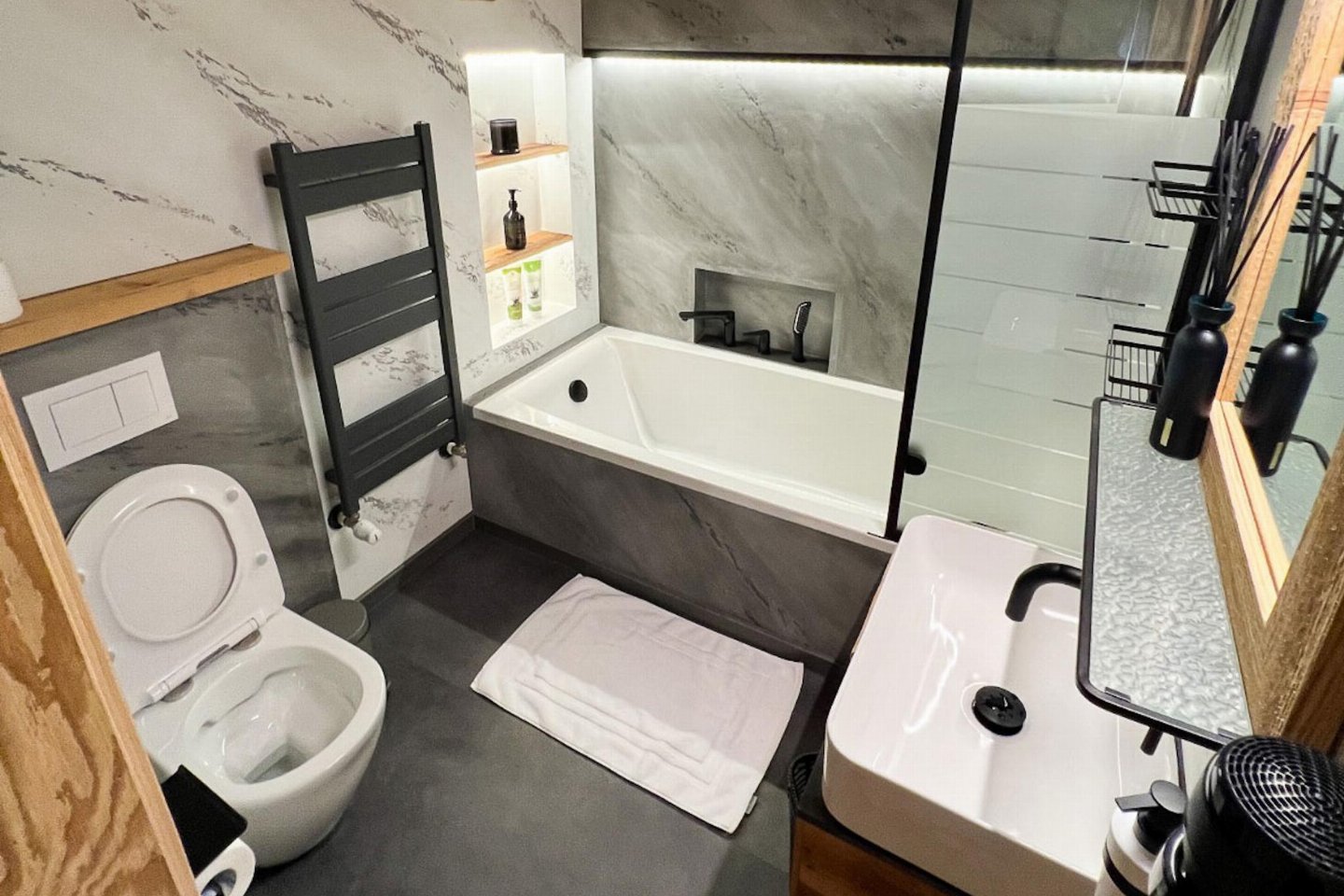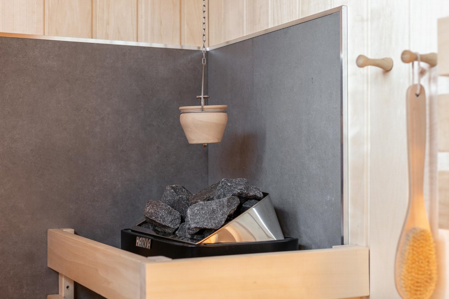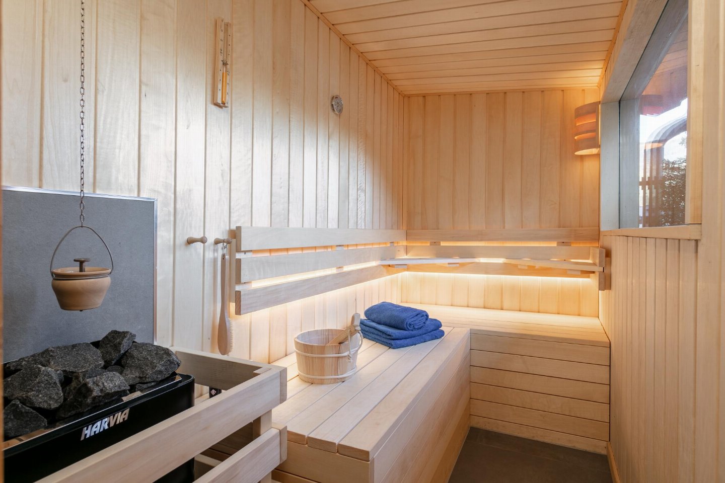 Begane grond(eigen entree): hal met zithoek , eetkamer met eettafel(4 personen) , keuken met waterkoker, broodrooster, fornuis, afzuigkap, koffiezetapparaat(volledig automatisch, bonen), oven, afwasmachine, koelkast( vriesvak), vriezer , slaapkamer met 1-pers. bed, 2-pers. bed , badkamer met wasbak, douche, haardroger , toilet met wasbak, wc, wasmachine , saunaruimte(privé, buitenom bereikbaar) met sauna , tuin(gedeeld met andere gasten, deels omheind, 20 m2) met terras