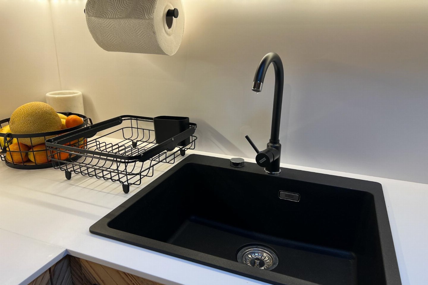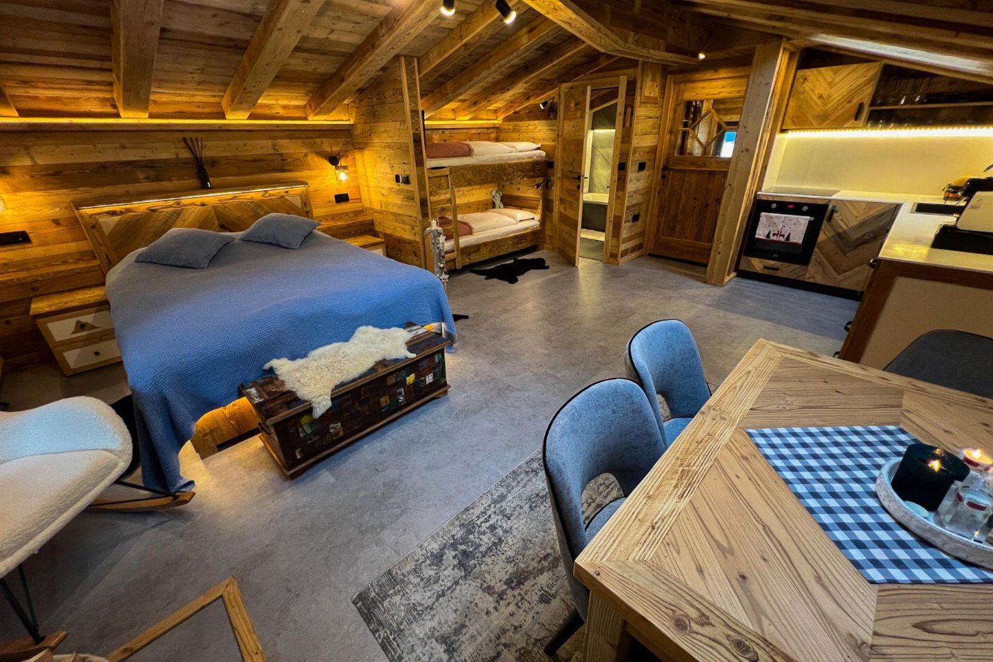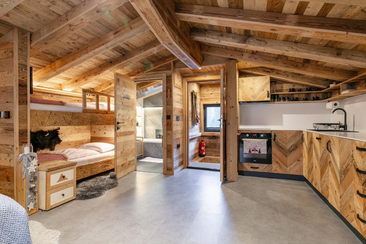 Op de 1e etage: open keuken met waterkoker, fornuis(4 kookplaten, inductie), afzuigkap, koffiezetapparaat(cups), oven, afwasmachine, koel-/vriescombinatie , woon/slaapkamer met 2-pers. bed, stapelbed, TV , badkamer met bad met douche, wasbak, wc, haardroger