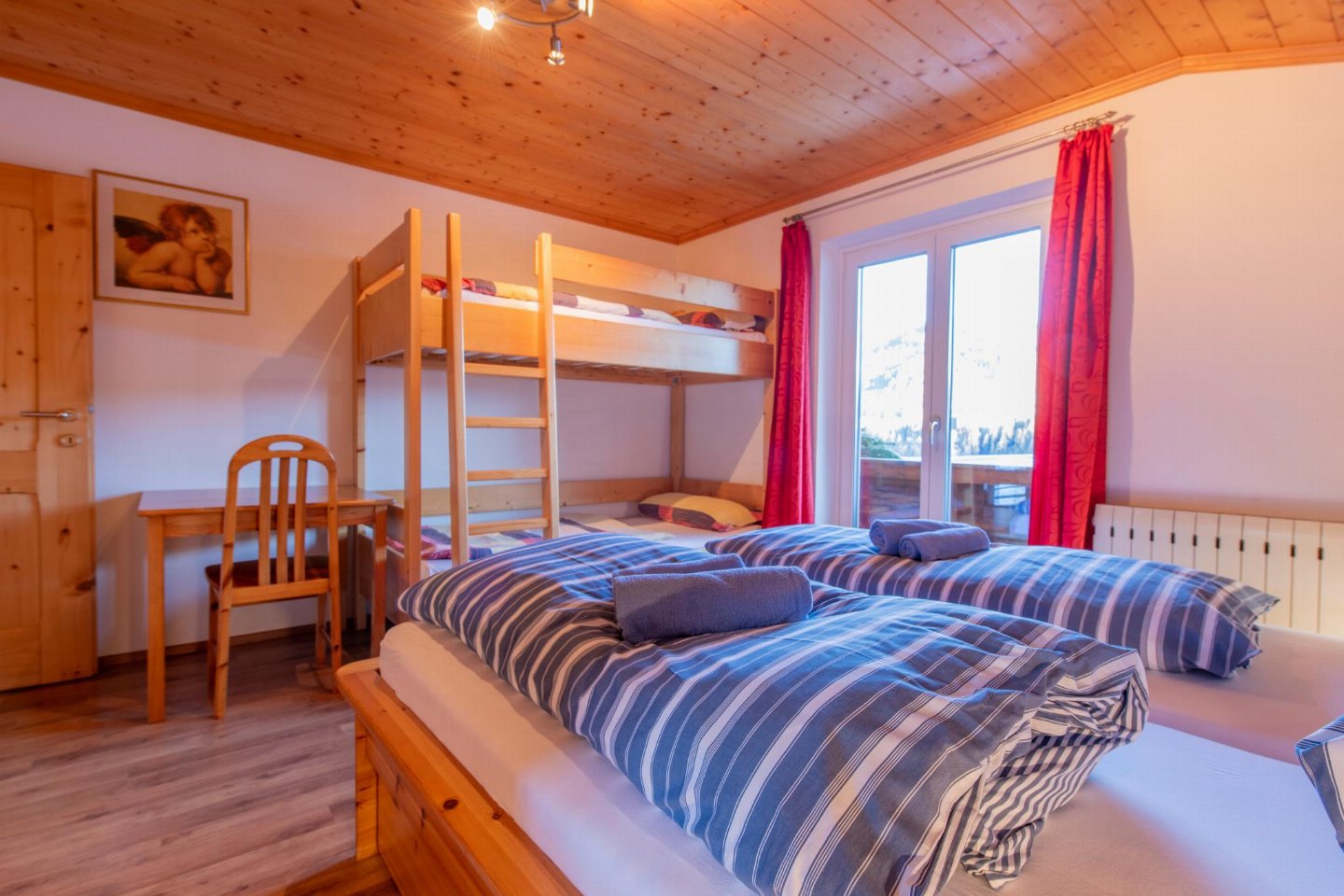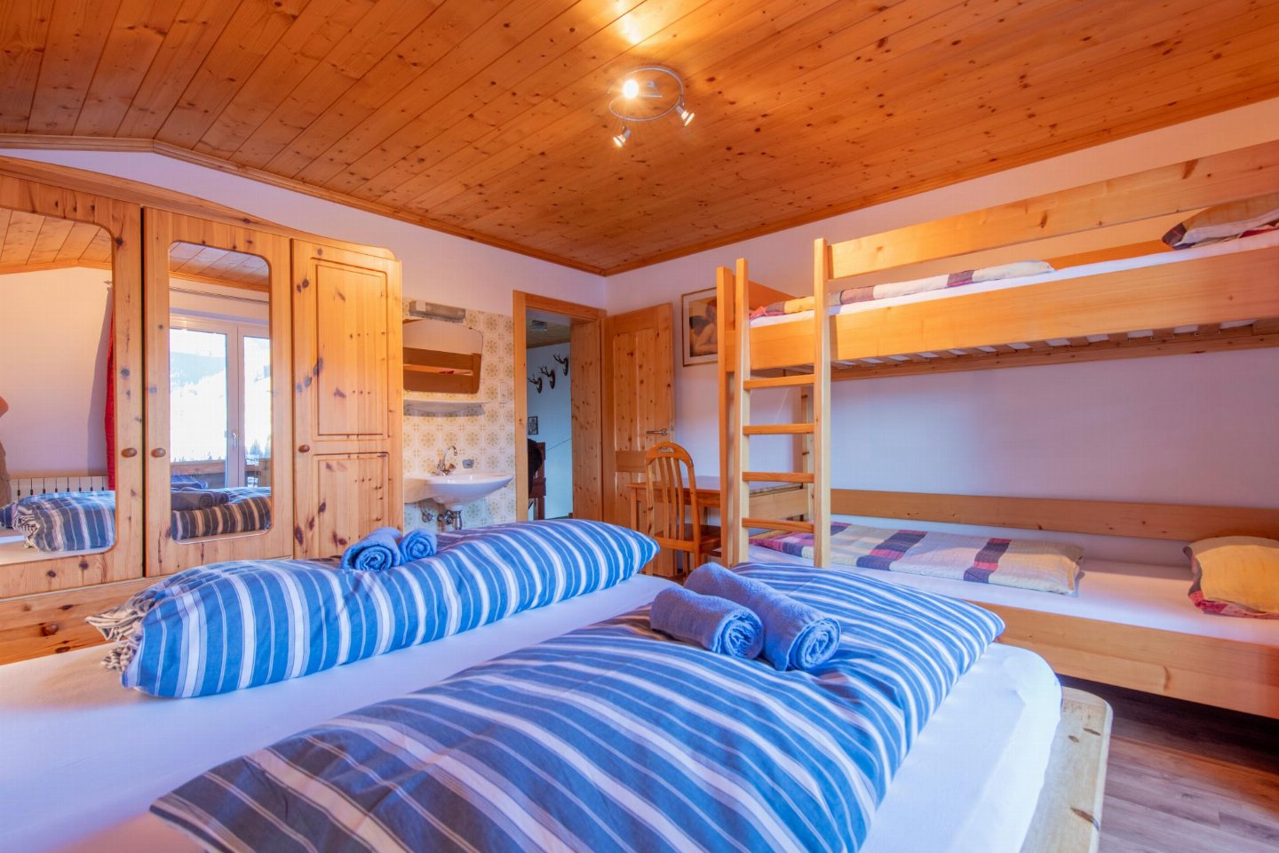 Op de 1e etage: woonkeuken met TV(flatscreen, satelliet), fornuis(4 kookplaten, keramisch), oven, magnetron, koelkast( vriesvak) , slaapkamer met 2-pers. bed(180 x 200 cm), wastafel , slaapkamer met 2-pers. bed(180 x 200 cm), stapelbed(90 x 200 cm), wastafel , badkamer met douche, wastafel, wc , toilet met wastafel, wc , balkon