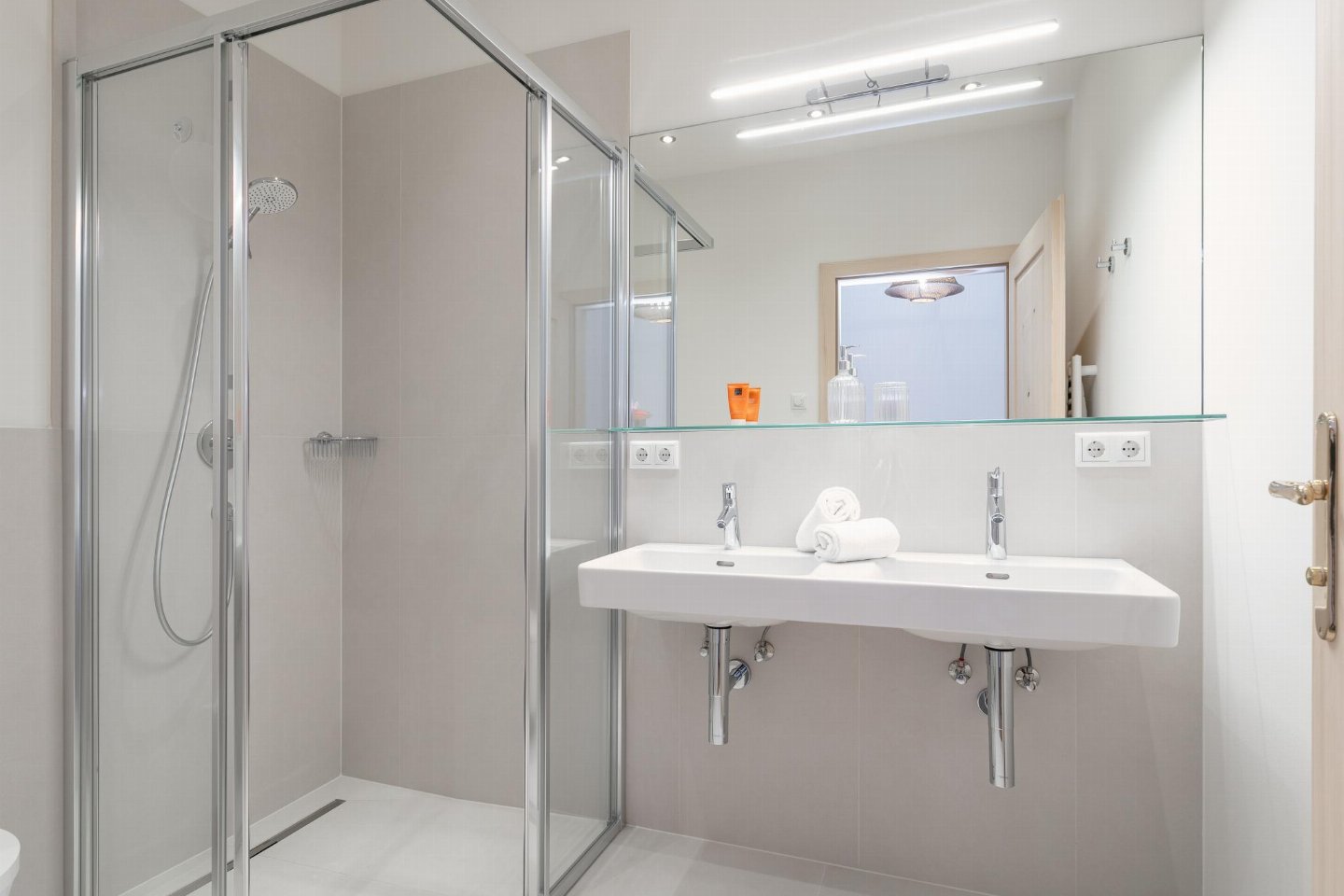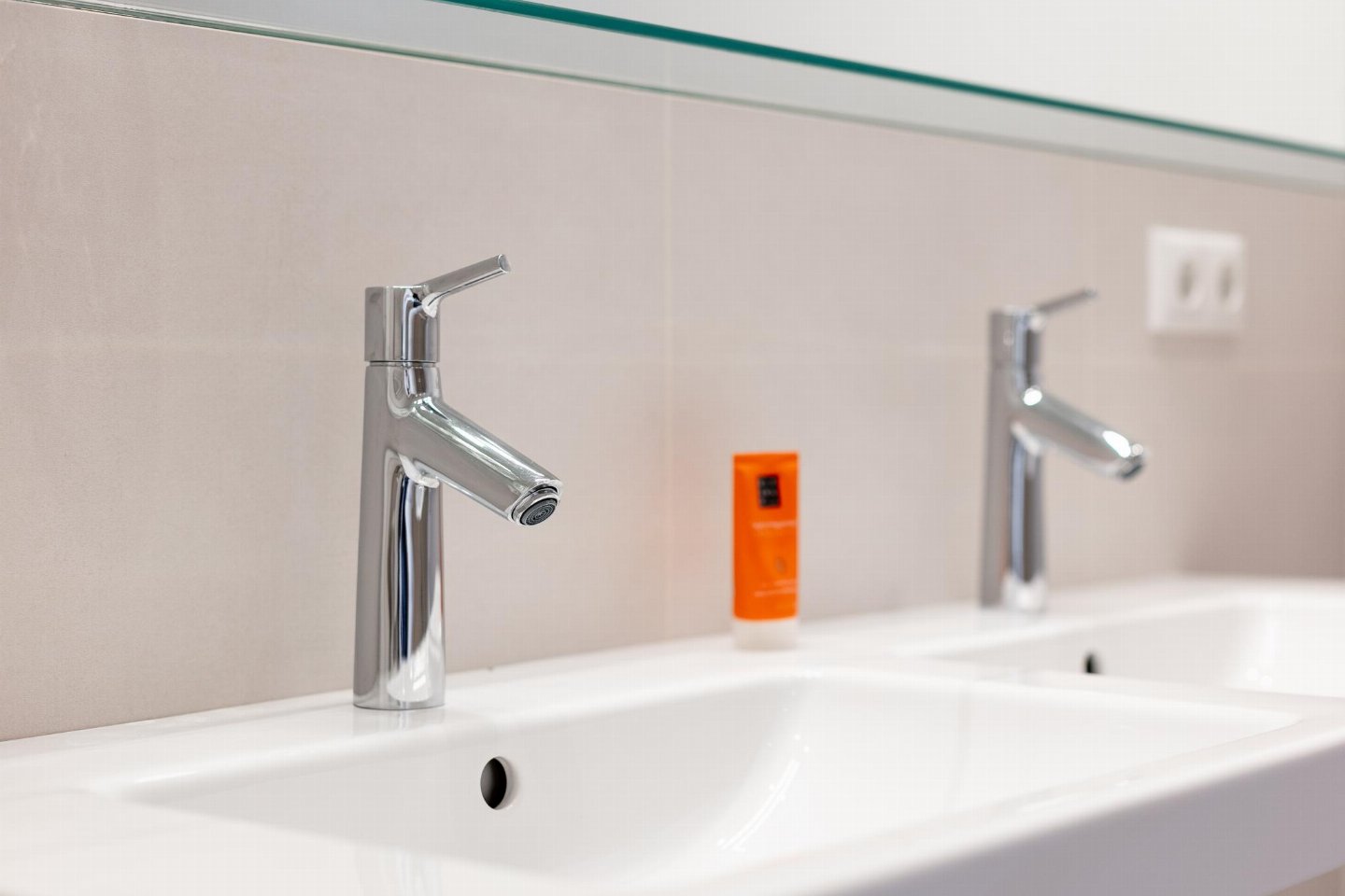 - Slaapkamer met badkamer (2-persoons bed, douche, 2x wastafel, wc)