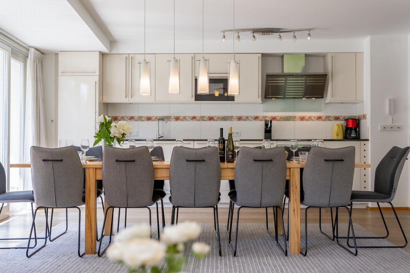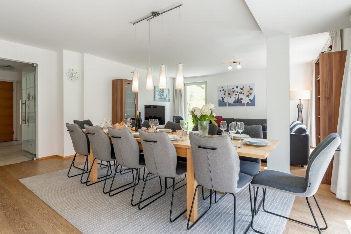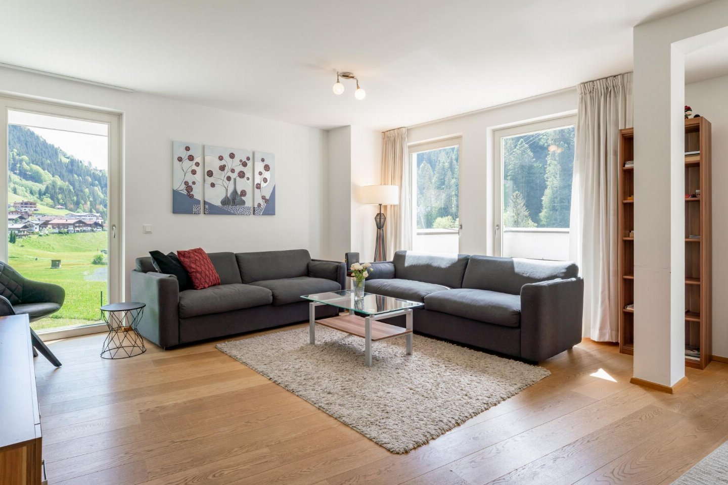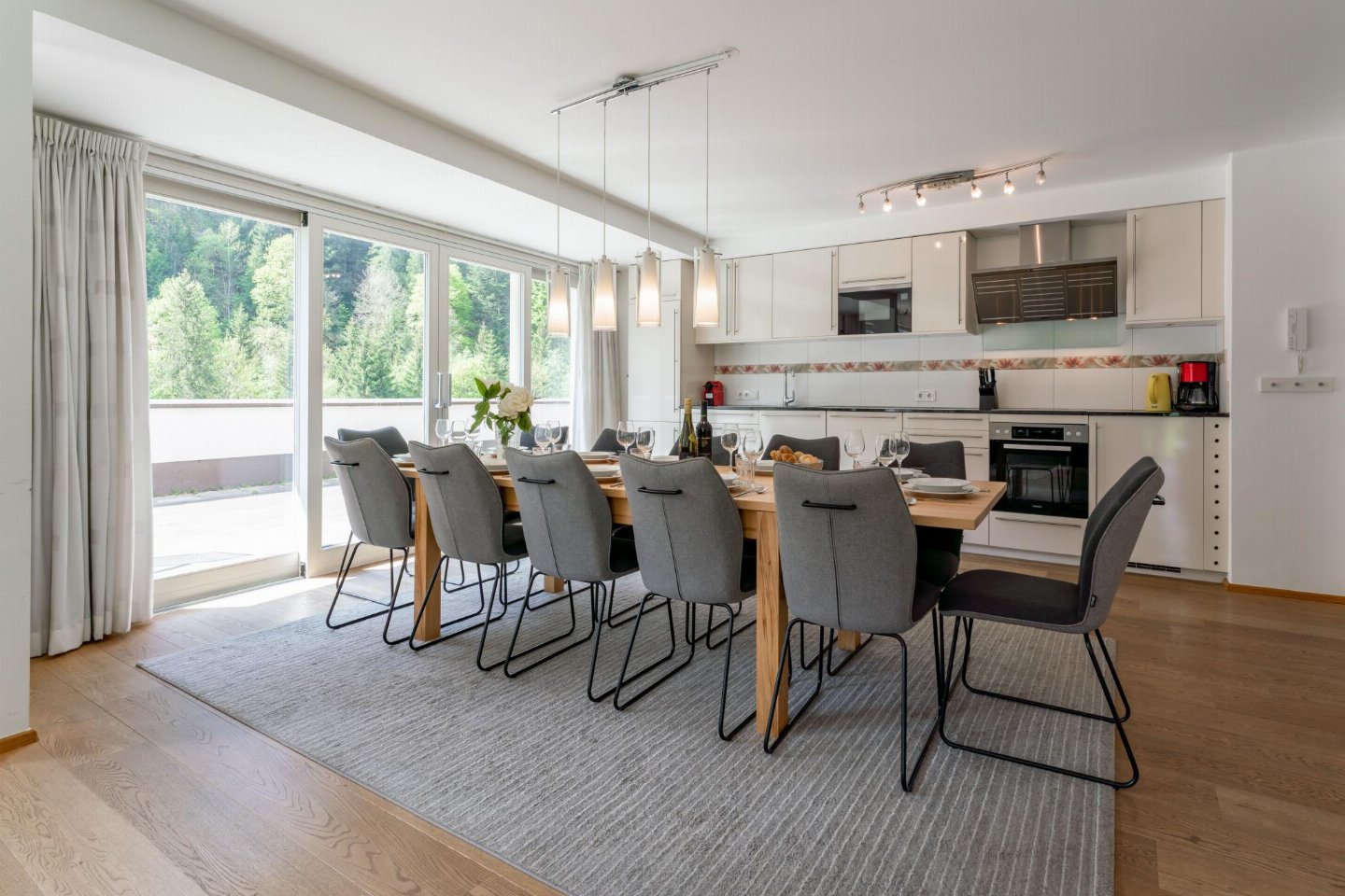 Wat een prachtig appartement op een fantastische locatie. Direct aan de nieuwe gondelbaan naar Zell am See, centraal in het dorp en naast de oefenweide van de skischool ligt deze luxueuze vakantiewoning. In de overdekte parkeergarage kunnen twee auto's staan, waarna je met de lift naar het appartement kunt. Het grote terras over de gehele breedte van het appartement wordt door de grote raampartijen bij de woonkamer betrokken. Een mooie ruime en lichte leefruimte