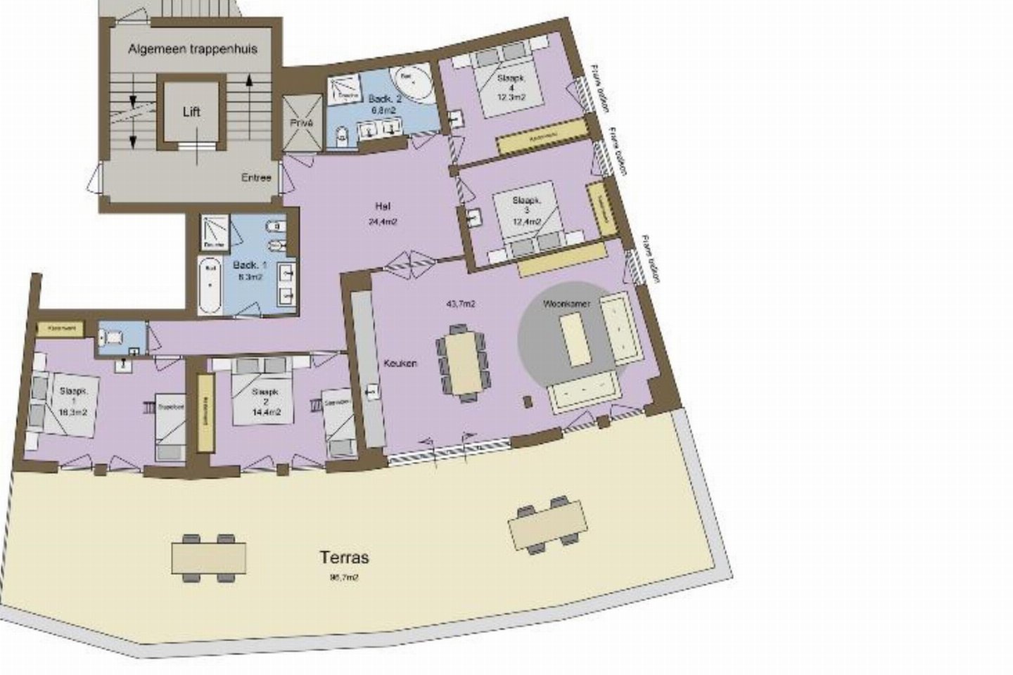 Op de 1e etage: woonkamer met TV, zithoek , open keuken met eettafel(12 personen), waterkoker, broodrooster, fornuis(4 kookplaten), koffiezetapparaat(cups, filtermaling), oven, magnetron, afwasmachine, koel-/vriescombinatie , slaapkamer met 2-pers. bed, stapelbed , slaapkamer met 2-pers. bed, stapelbed, wastafel , slaapkamer met 2-pers. bed, wastafel , slaapkamer met 2-pers. bed, TV, wastafel , badkamer met ligbad, douche, 2x wastafel, wc, bidet , badkamer met ligbad, douche, 2x wastafel, wc , toilet, overloop, terras(100 m2)