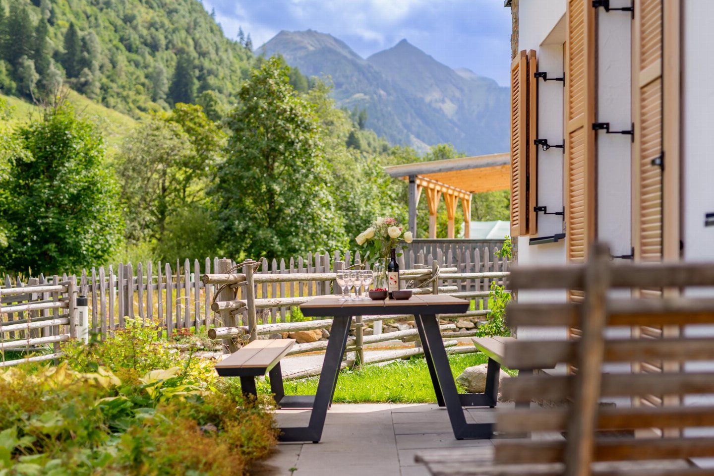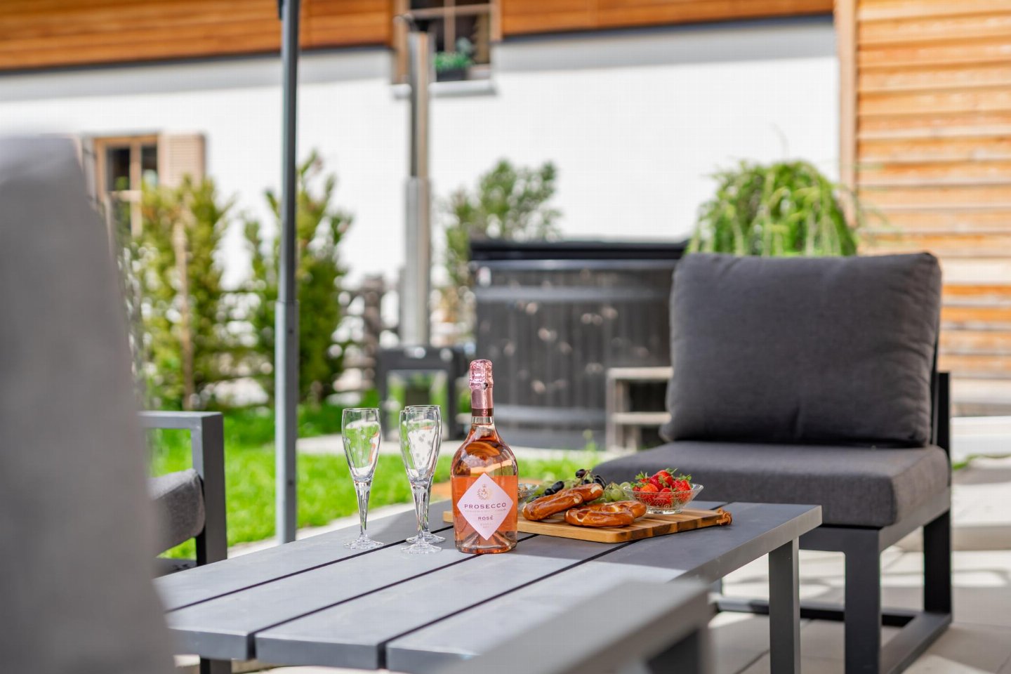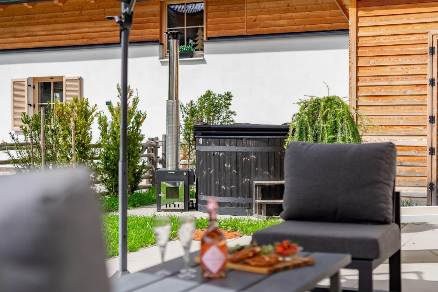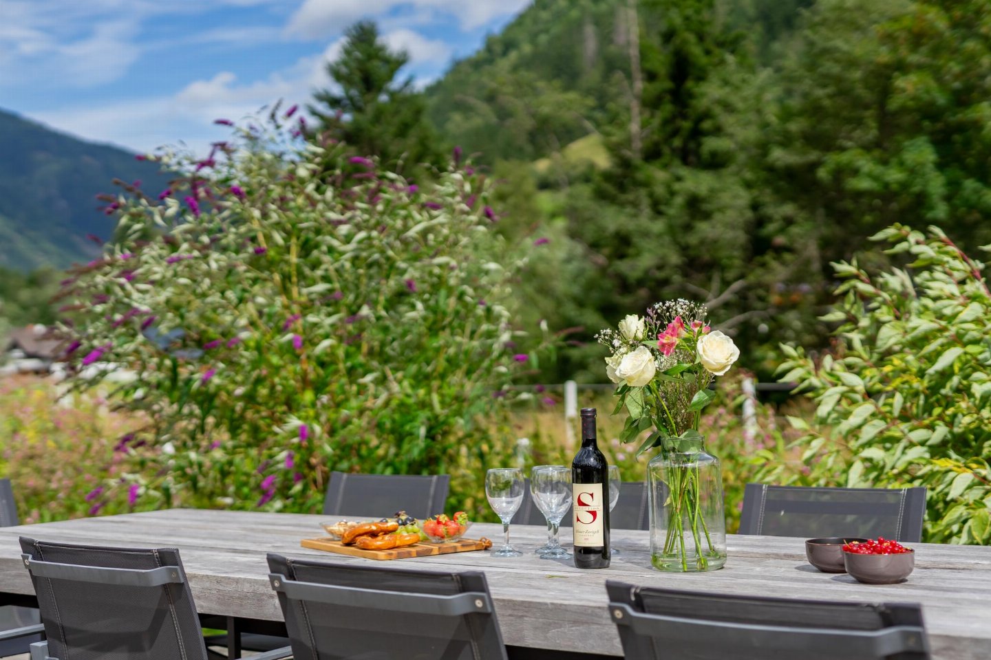 Buiten zijn er 3 terrassen: één bij de beek met een luxe eettafel, een tweede met een lounge set en een derde met een picknicktafel. Het verblijf bevindt zich op een kleinschalig chaletpark op een glooiende helling, omringd door serene natuur.