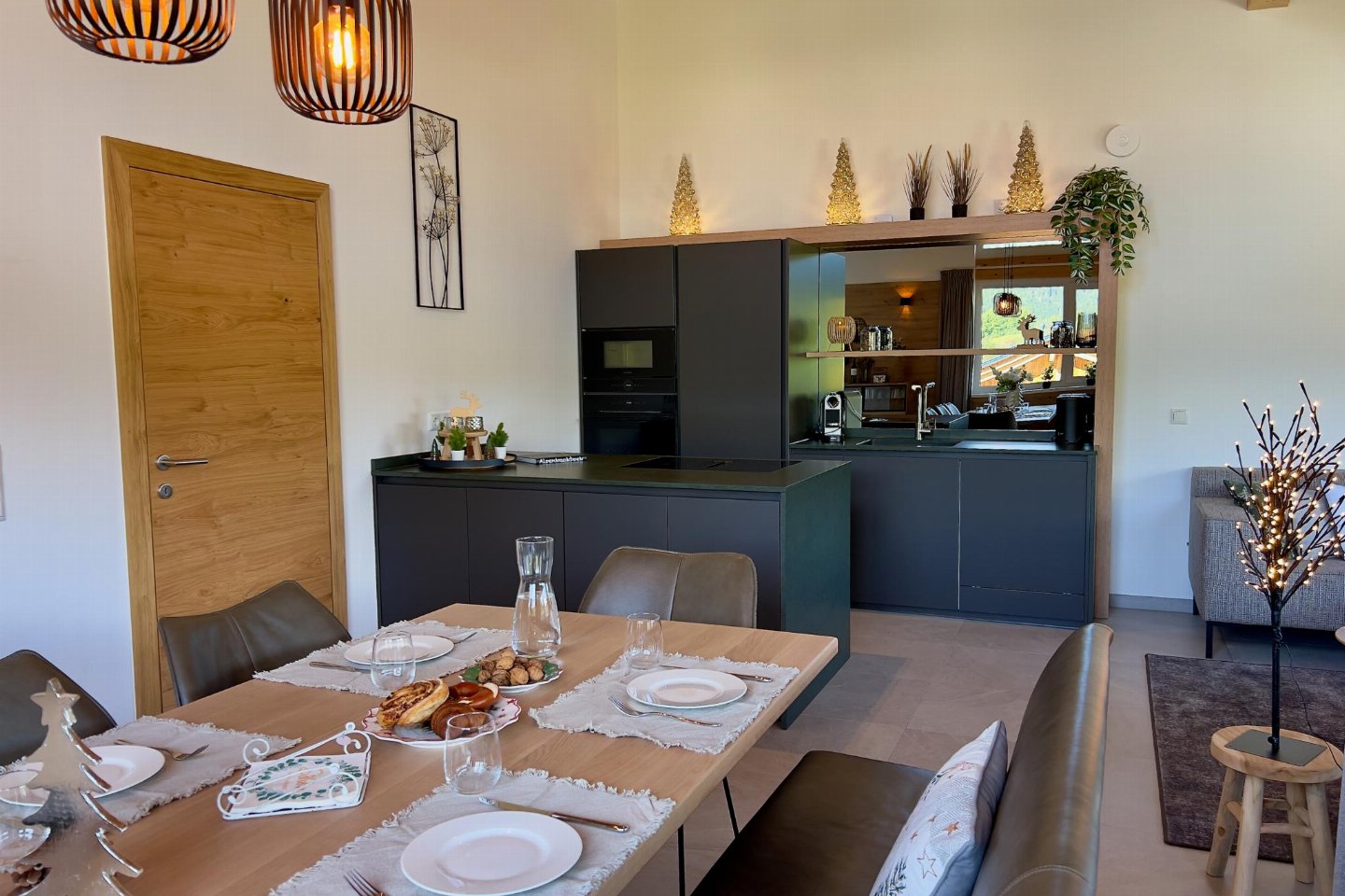 1e etage: woonkamer (TV, eettafel voor 7 personen, zithoek), open keuken (kookplaat, waterkoker, afzuigkap, koffiezetapparaat (filtermaling), koffiezetapparaat (Nespresso cups), oven, magnetron, afwasmachine, koel-/vriescombinatie), slaapkamer (2-pers. bed), badkamer (douche, wastafel, wc), balkon (eettafel voor 7 personen).