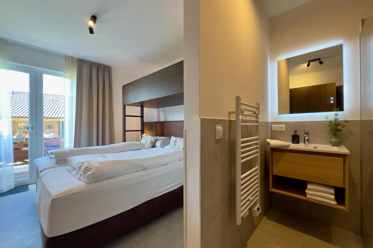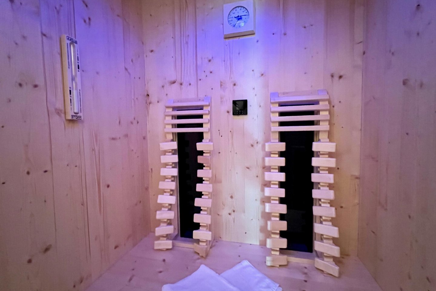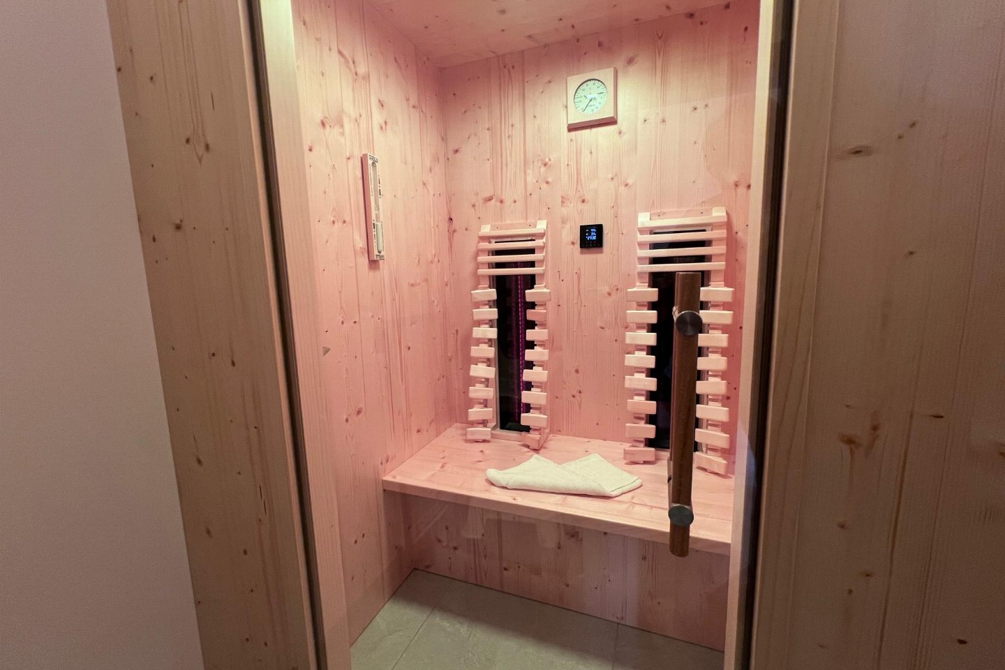Begane grond: hal, slaapkamer met badkamer (2-pers. bed, douche, wastafel), slaapkamer met badkamer (1-pers. hoogslaper, 2-pers. bed, douche, wastafel), toilet (wastafel, wc), skiberging (skischoenverwarmers), infraroodsauna.