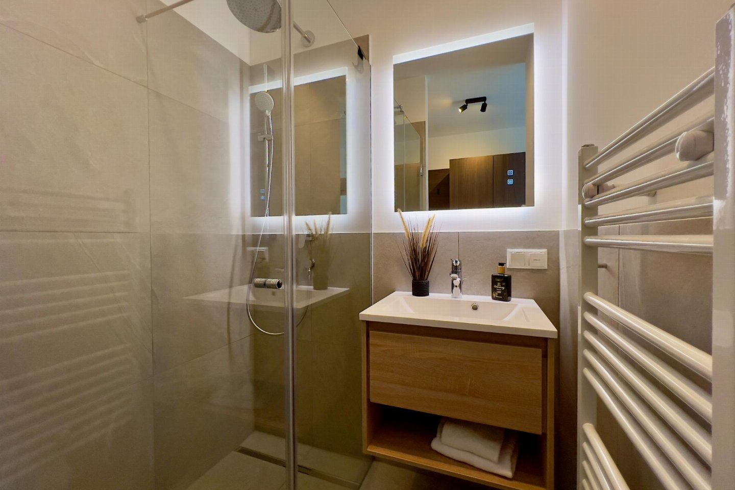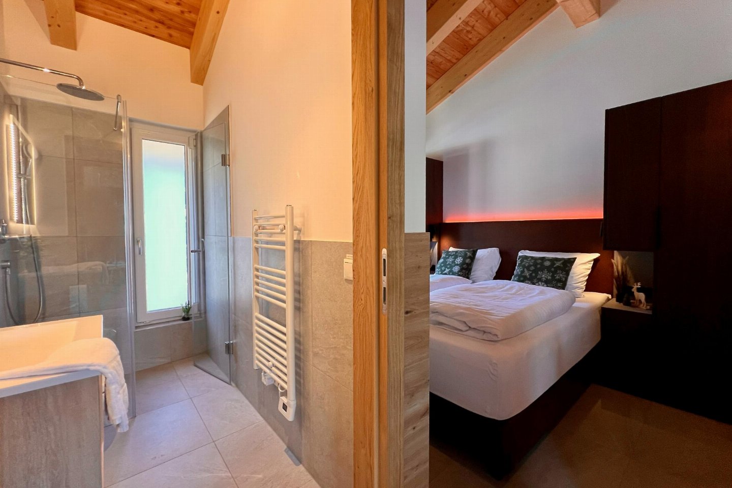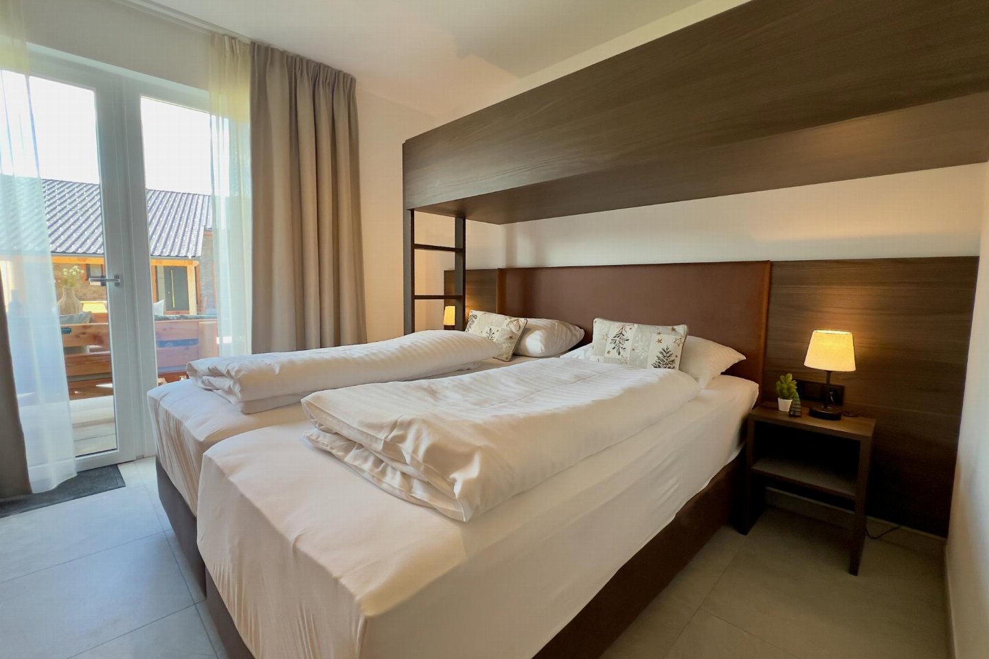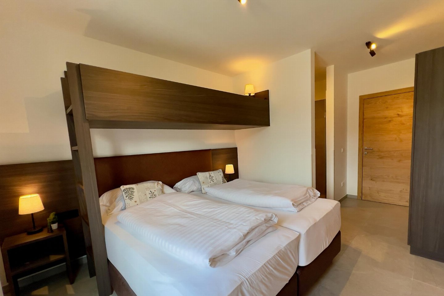 Begane grond: hal, slaapkamer met badkamer (2-pers. bed, douche, wastafel), slaapkamer met badkamer (1-pers. hoogslaper, 2-pers. bed, douche, wastafel), toilet (wastafel, wc), skiberging (skischoenverwarmers), infraroodsauna.