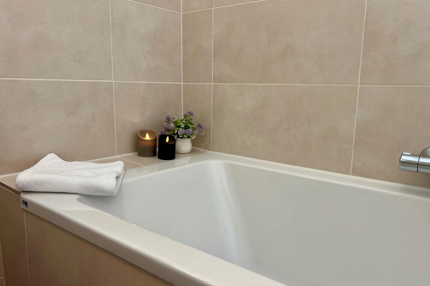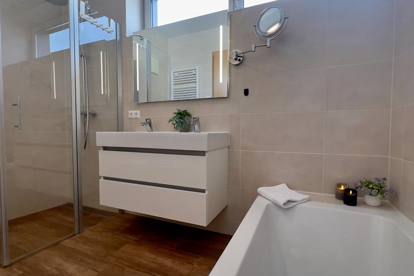 1e etage: woonkamer (2-pers. slaapbank, TV, eettafel (10 personen), zithoek, terras (privé, omheind)), open keuken (kookplaat, waterkoker, koffiezetapparaat (cups), oven, magnetron, afwasmachine, koel-/vriescombinatie), slaapkamer (1-pers. slaapbank, 2-pers. bed (boxspring), TV), slaapkamer (2-pers. bed (boxspring)), badkamer (ligbad, douche, wastafel, wc, haardroger), toilet (wastafel, wc).