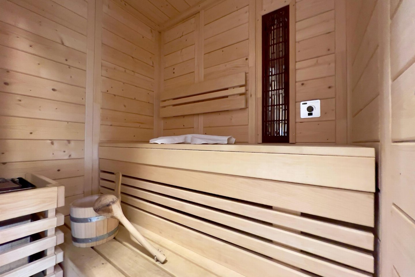 Begane grond: hal, slaapkamer met badkamer (2-pers. bed (boxspring), stapelbed, douche, wastafel, wc, haardroger), berging (wasdroger, wasmachine, skischoenverwarmers, strijkplank, strijkijzer), sauna.