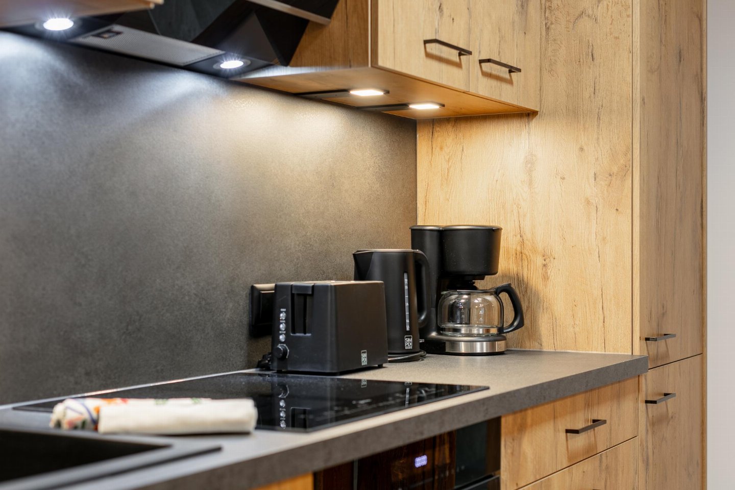 Begane grond: keuken met waterkoker, fornuis(4 kookplaten, inductie), koffiezetapparaat(filtermaling), oven, koel-/vriescombinatie , woon/eetkamer met 2-pers. slaapbank, eettafel(4 personen) , slaapkamer met 2-pers. bed(180 x 200 cm) , badkamer met wasbak, douche, wc , balkon
