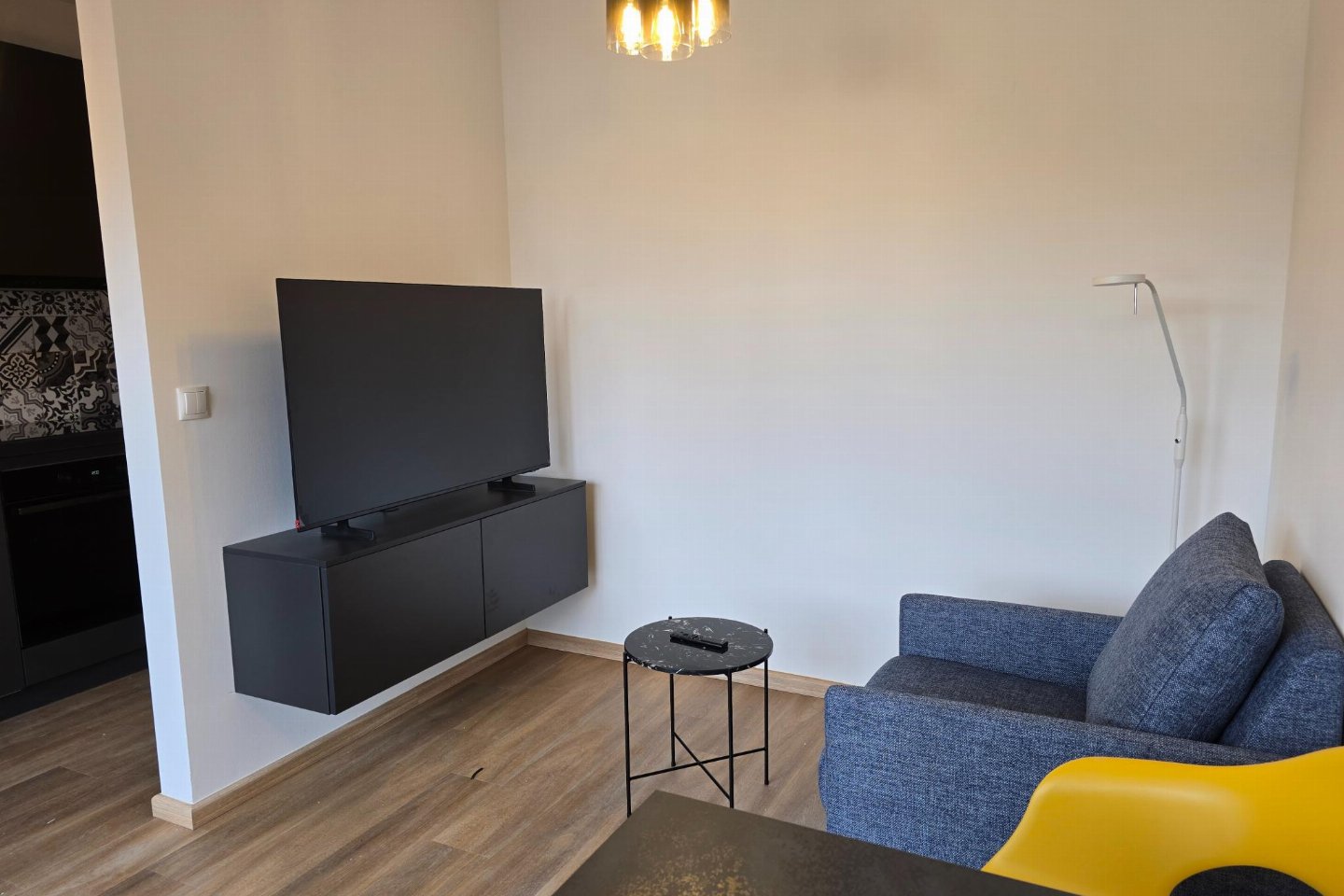 Op de 1e etage: open keuken met kookplaat, waterkoker, fornuis(4 kookplaten, inductie), koffiezetapparaat(nespresso cups), oven, magnetron, koel-/vriescombinatie , woon/eetkamer met TV, eettafel(3 personen), zithoek , slaapkamer met 1-pers. bed(120 x 200 cm) , badkamer met douche, wastafel, wc , balkon