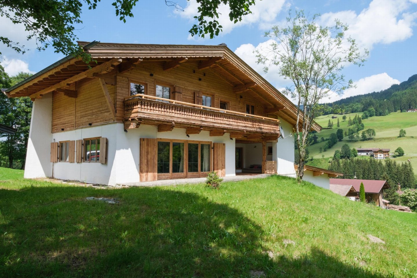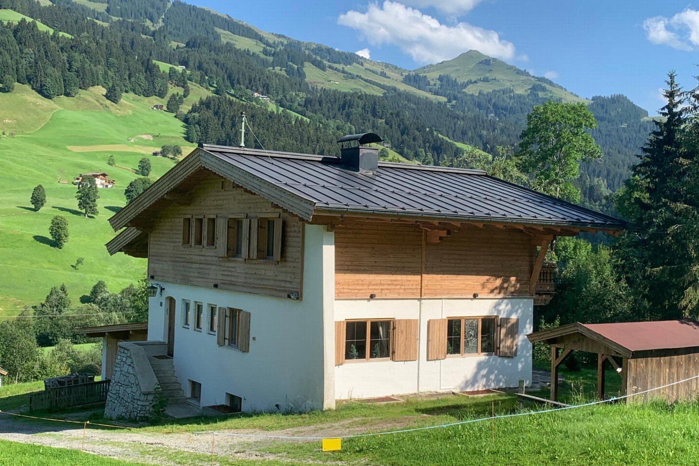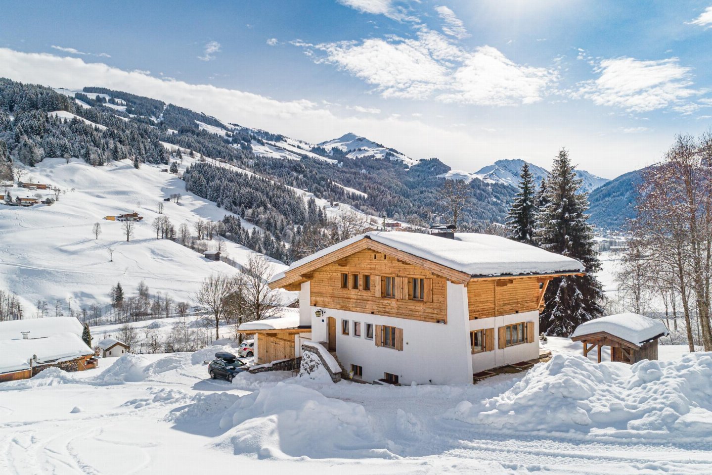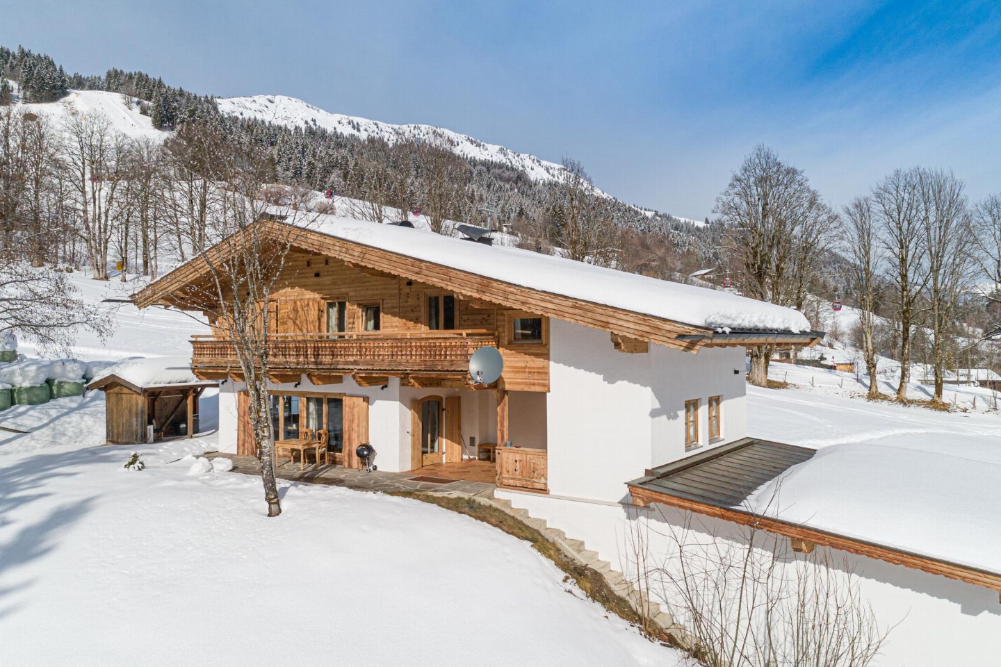 Oostenrijk, Tirol, KirchbergMidden in de Kitzbühler Alpen staat een vrijstaand Oostenrijks chalet. Perfect gelegen aan de Ki-West-Bahn dalafdaling, op 350 meter van de skilift en 300 meter van de skibus. Volledige privacy, 2 badkamers met 2 douches elk, aparte toiletten op elke etage, bijgebouw met bad (douche) en toilet.