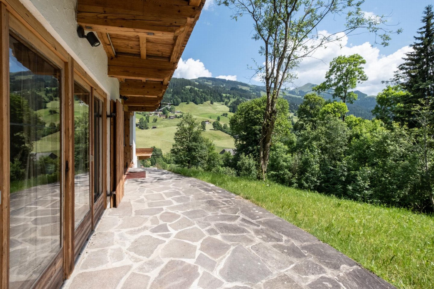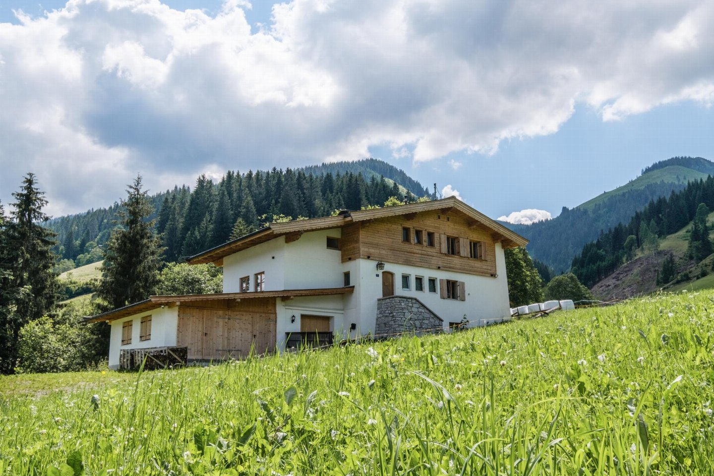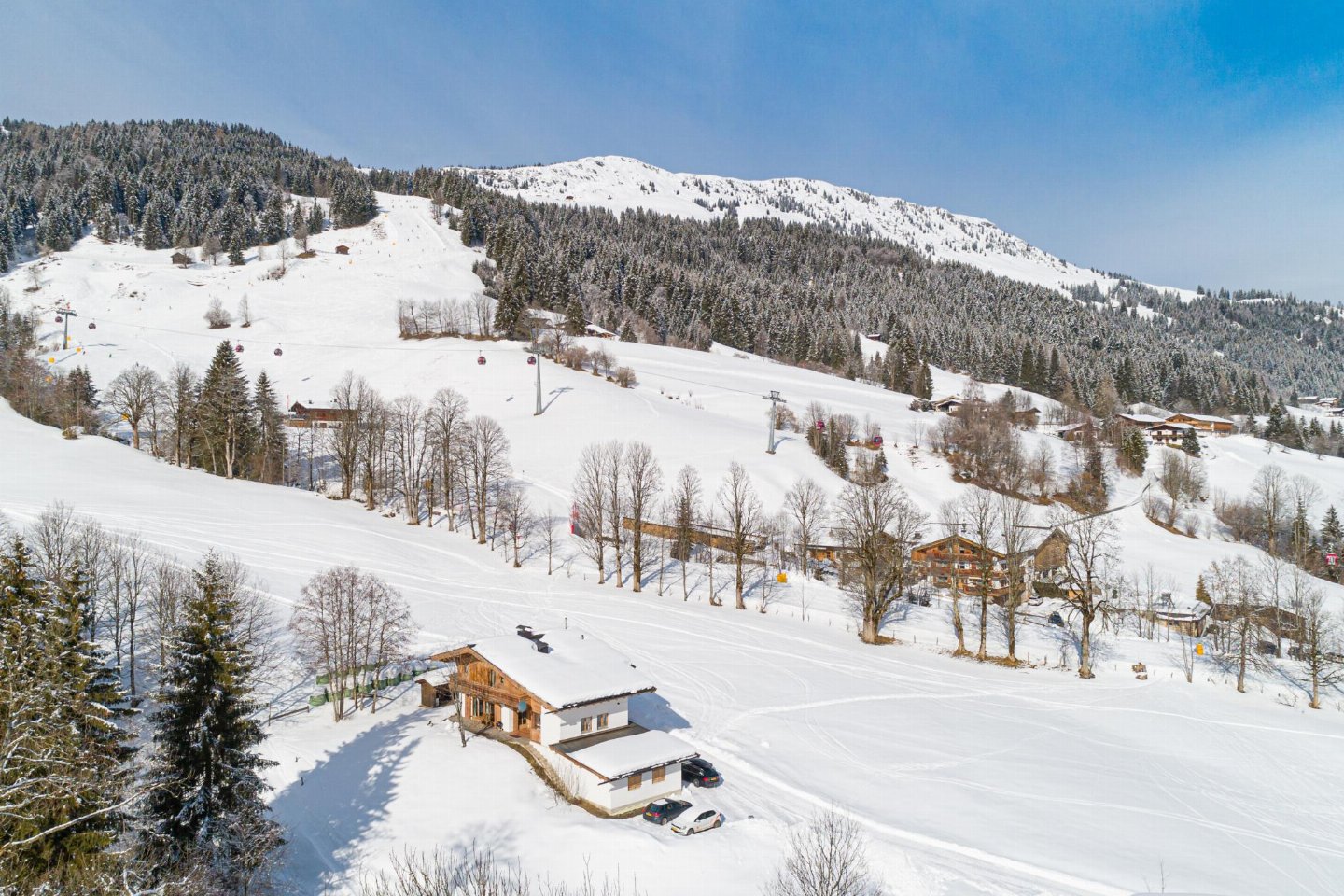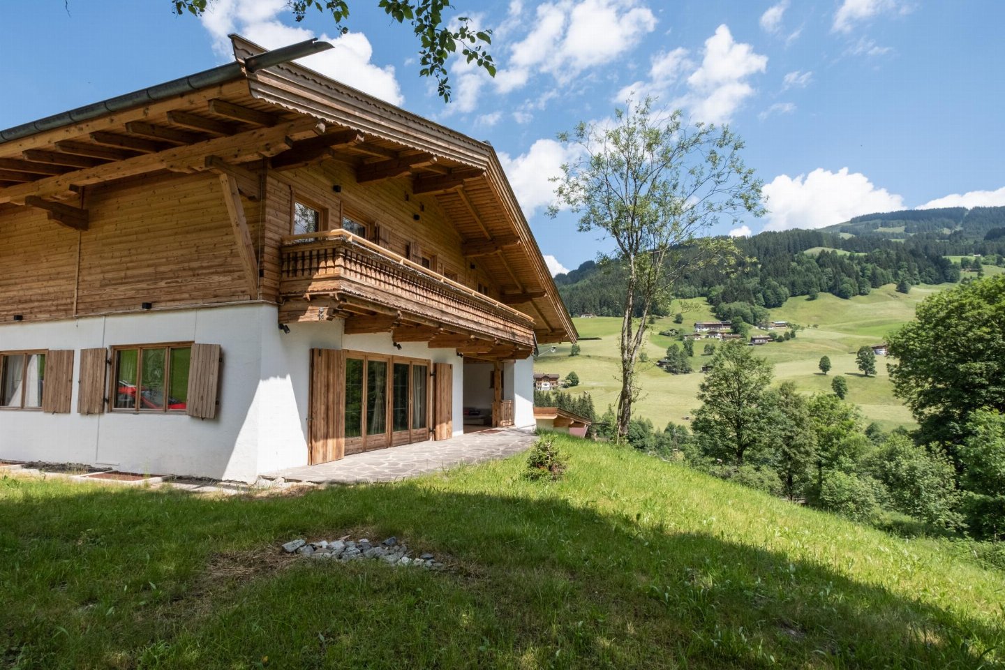 Oostenrijk, Tirol, KirchbergMidden in de Kitzbühler Alpen staat een vrijstaand Oostenrijks chalet. Perfect gelegen aan de Ki-West-Bahn dalafdaling, op 350 meter van de skilift en 300 meter van de skibus. Volledige privacy, 2 badkamers met 2 douches elk, aparte toiletten op elke etage, bijgebouw met bad (douche) en toilet.