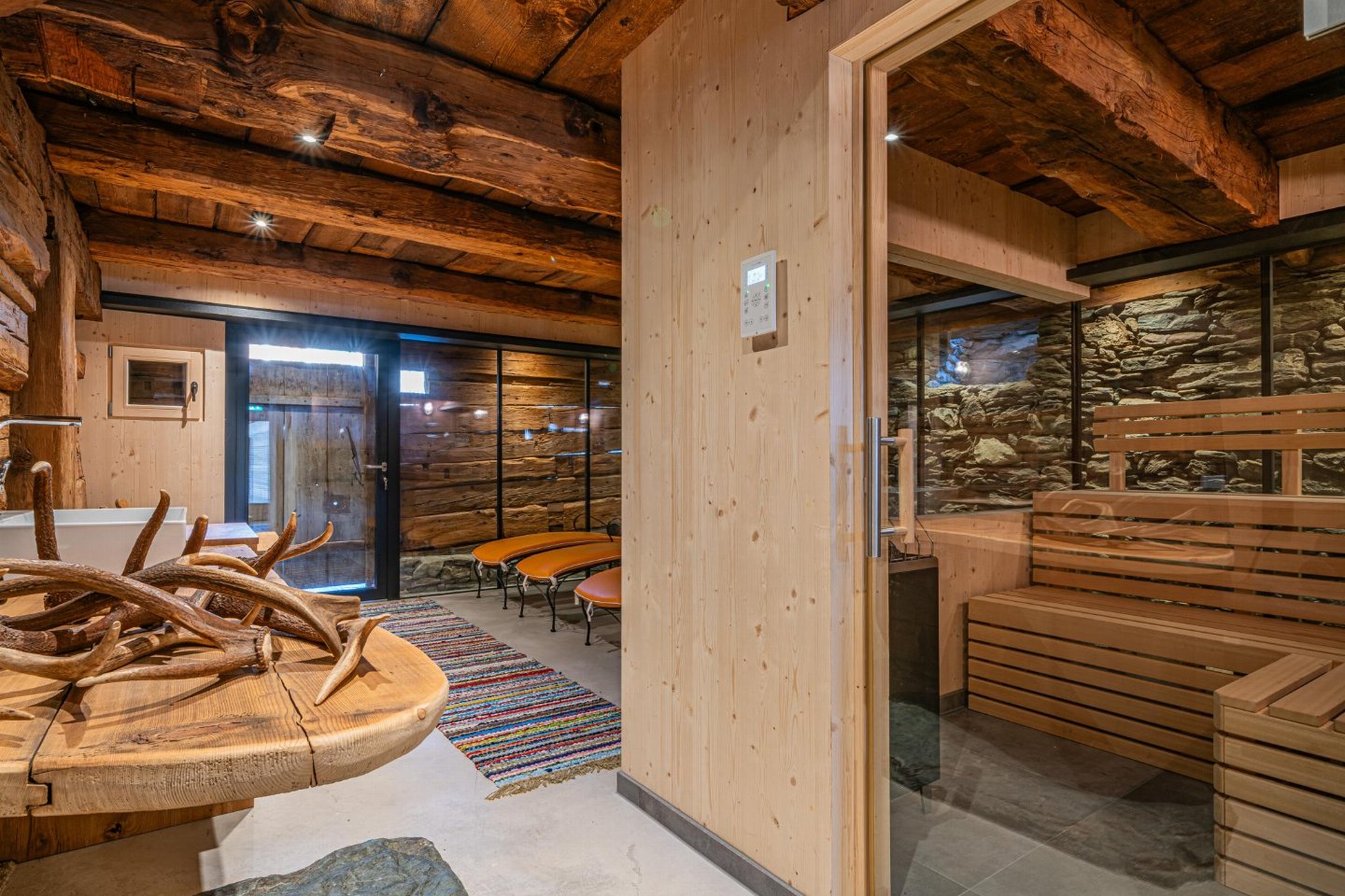 wasruimte(wasmachine(gedeeld met andere gasten)), recreatieruimte(gedeeld met andere gasten), saunaruimte(gedeeld met andere gasten)(wasbak, douche, sauna, wc), skiberging(gedeeld met andere gasten), 1x carport, terras(privé), 1x parking