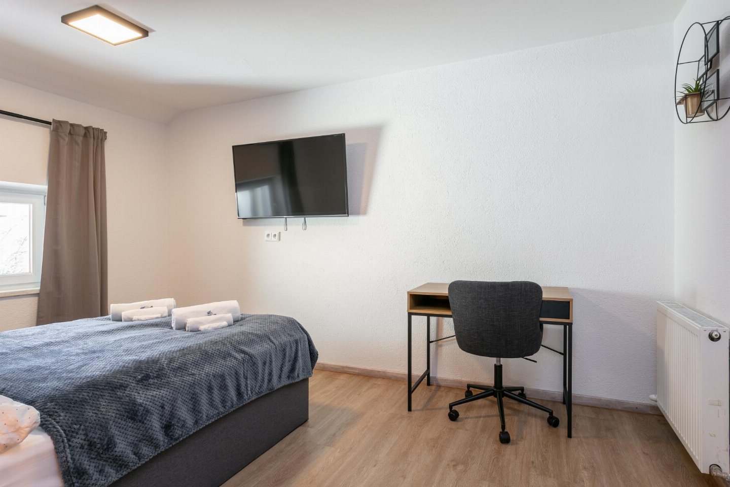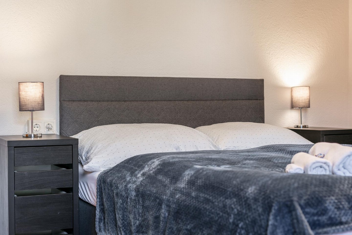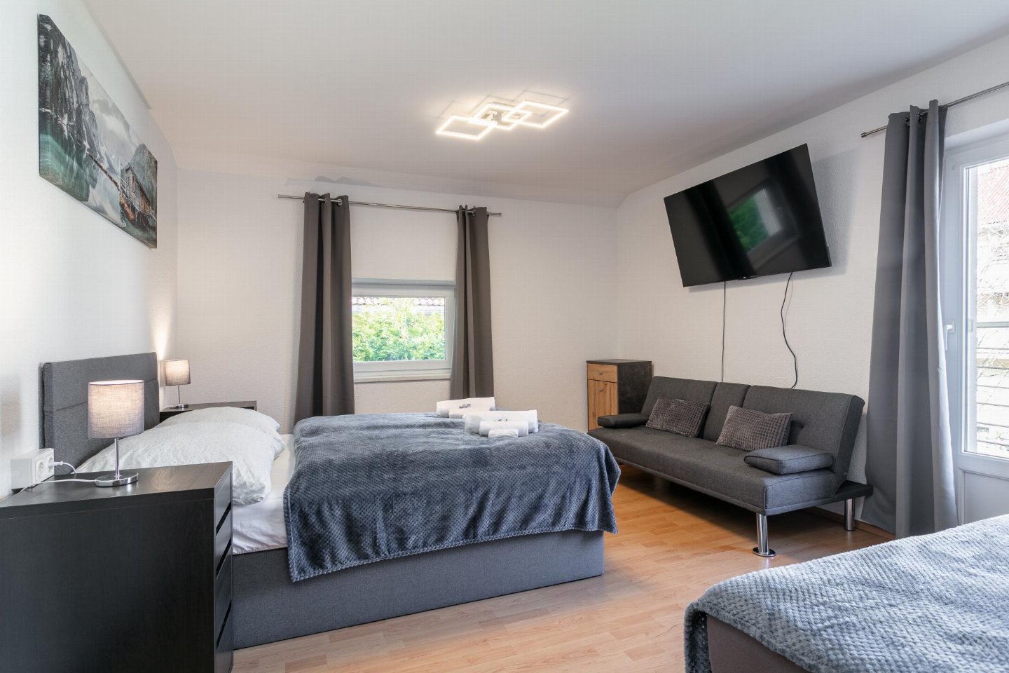 Op de 1e etage: slaapkamer met 1-pers. bed(90 x 200 cm), 2-pers. bed(140 x 200 cm), TV, zithoek , slaapkamer met 1-pers. slaapbank, 2-pers. bed(180 x 200 cm), TV , slaapkamer met 2-pers. bed(140 x 200 cm), TV , badkamer met wasbak, douche, wc , berging met wasdroger , balkon met eettafel(4 personen)