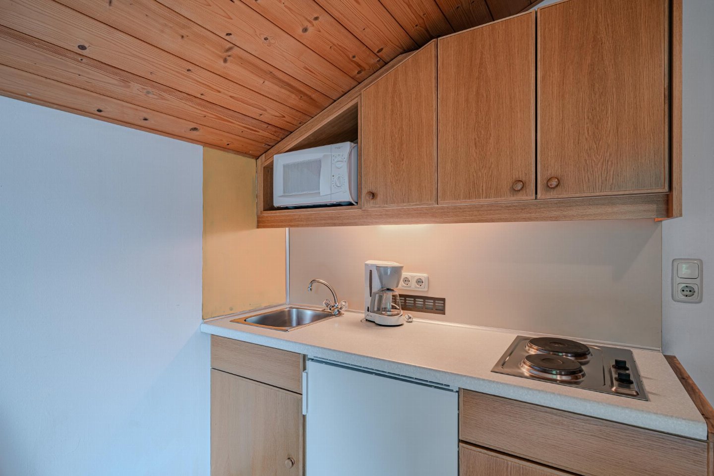 - keuken (waterkoker, broodrooster, fornuis (2 kookplaten), koffiezetapparaat (filtermaling), koel-/vriescombinatie)