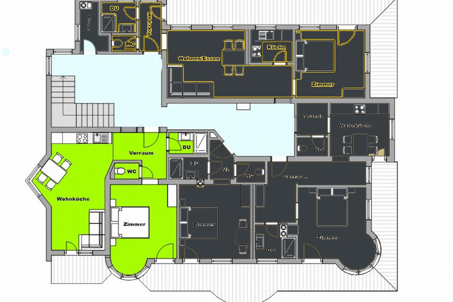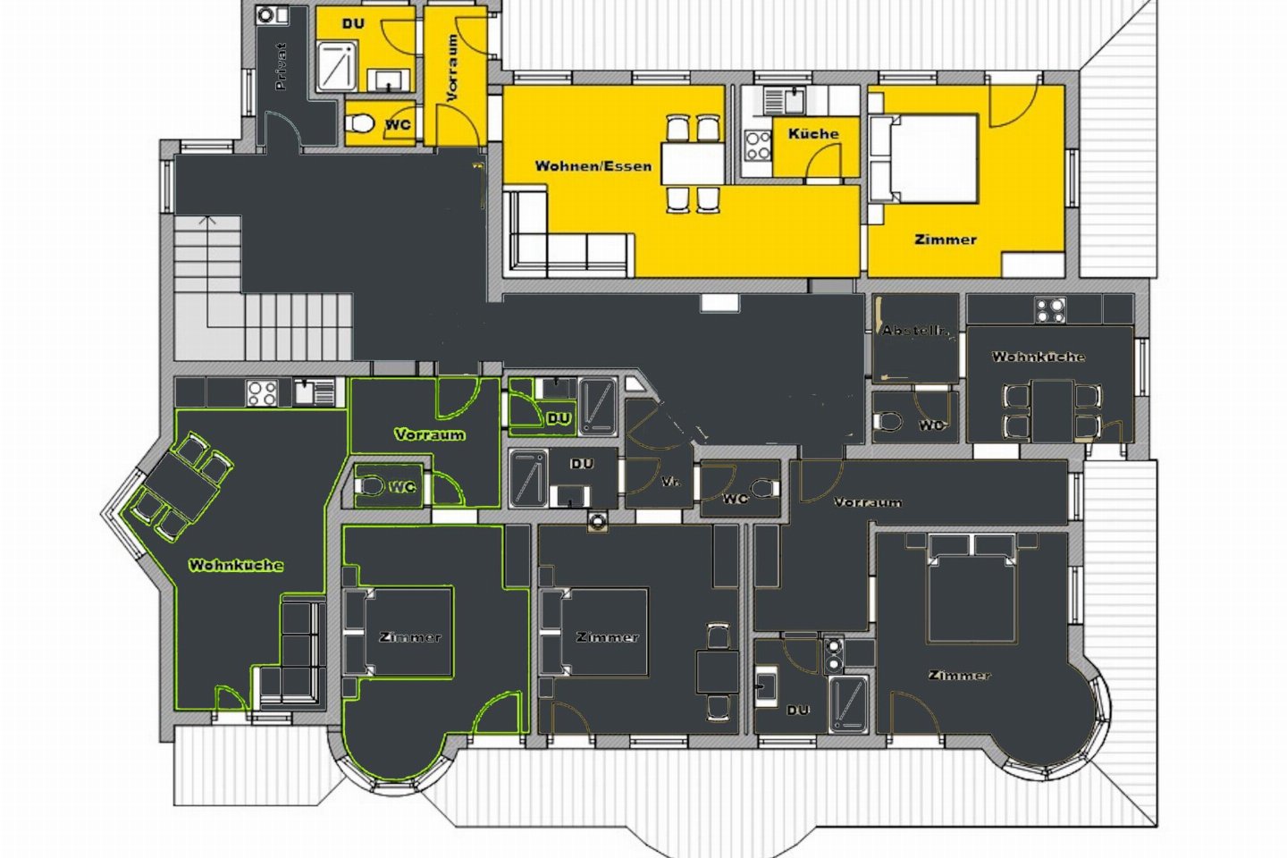Op de 1e etage(eigen entree): (woonkamer(TV, eettafel(4 personen)), 3x keuken(kookplaat(4 kookplaten), waterkoker, afzuigkap, koffiezetapparaat(pads), oven, afwasmachine), 2x woon/eetkamer(2-pers. slaapbank, TV, eettafel(4 personen)), 4x slaapkamer(2-pers. bed(180 x 200 cm)), 4x badkamer(douche, wastafel), 4x toilet(wc), 3x balkon(eettafel))